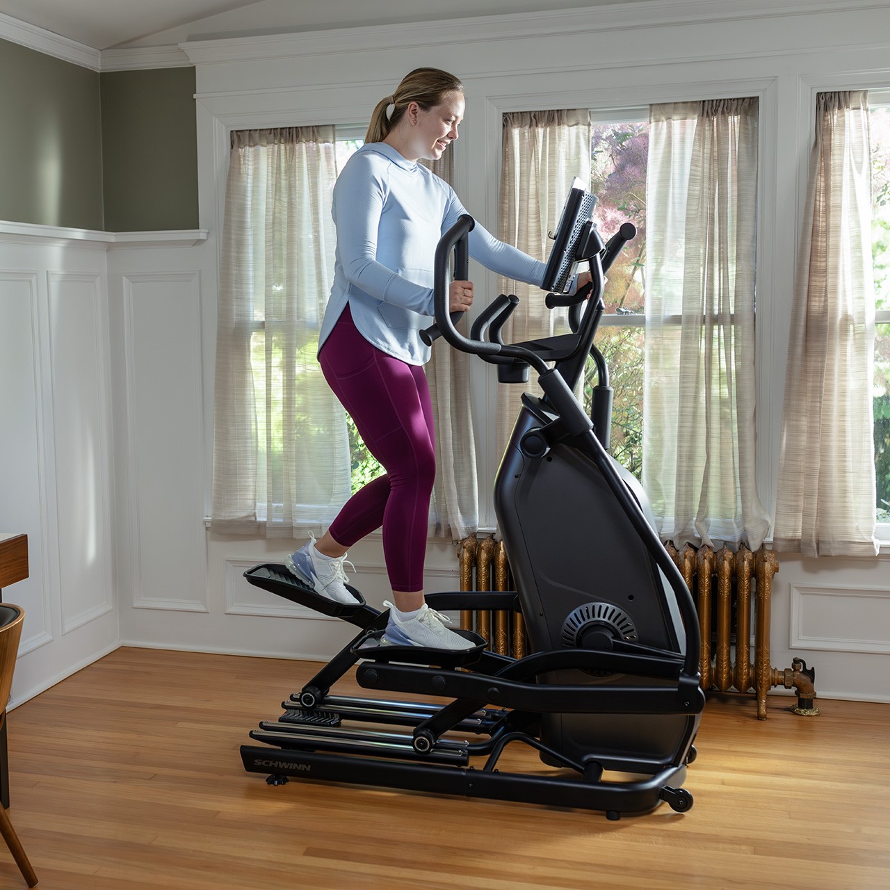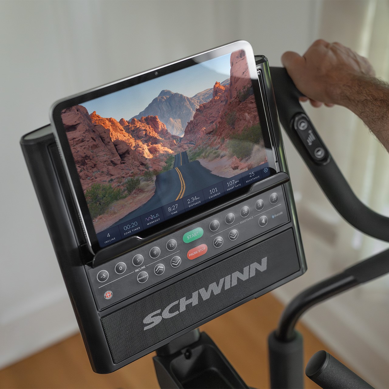 Weitere Features wie Tablet- und Flaschenhalterung sowie Antirutsch-Trittflächen für einen sicheren Stand gehören zur Ausstattung dieses kompakten Ellipsentrainers von Schwinn.