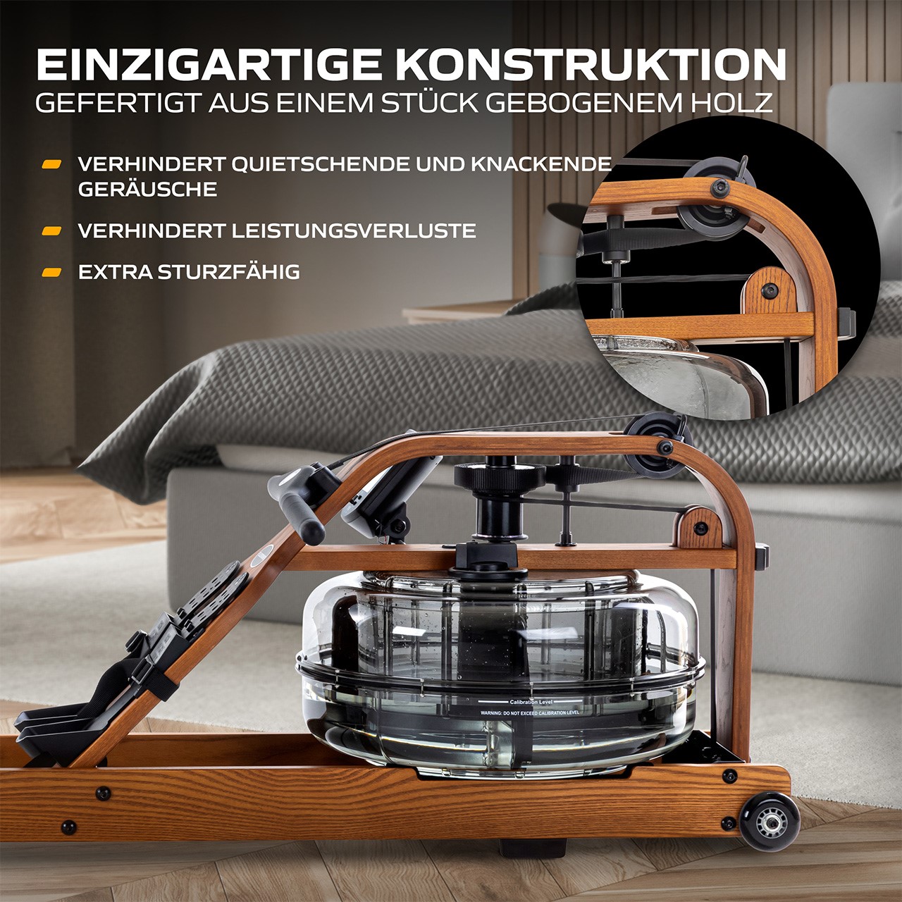 Im Gegensatz zu herkömmlichen Rudergeräten besteht der Frontrahmen des Viking 3 V aus einem einzigen Stück massiven Eschenholzes. Durch ein aufwendiges Biegeverfahren wird der Rahmen schonend geformt, wodurch er sich optimal an den patentierten 2-Kammern-Tank anpasst und wesentlich stabiler ist als verschraubte Modelle. Die handgefertigten Holzteile sind mit zwei Lackschichten versiegelt, um sie vor Abnutzung zu schützen und ihre Langlebigkeit zu gewährleisten.