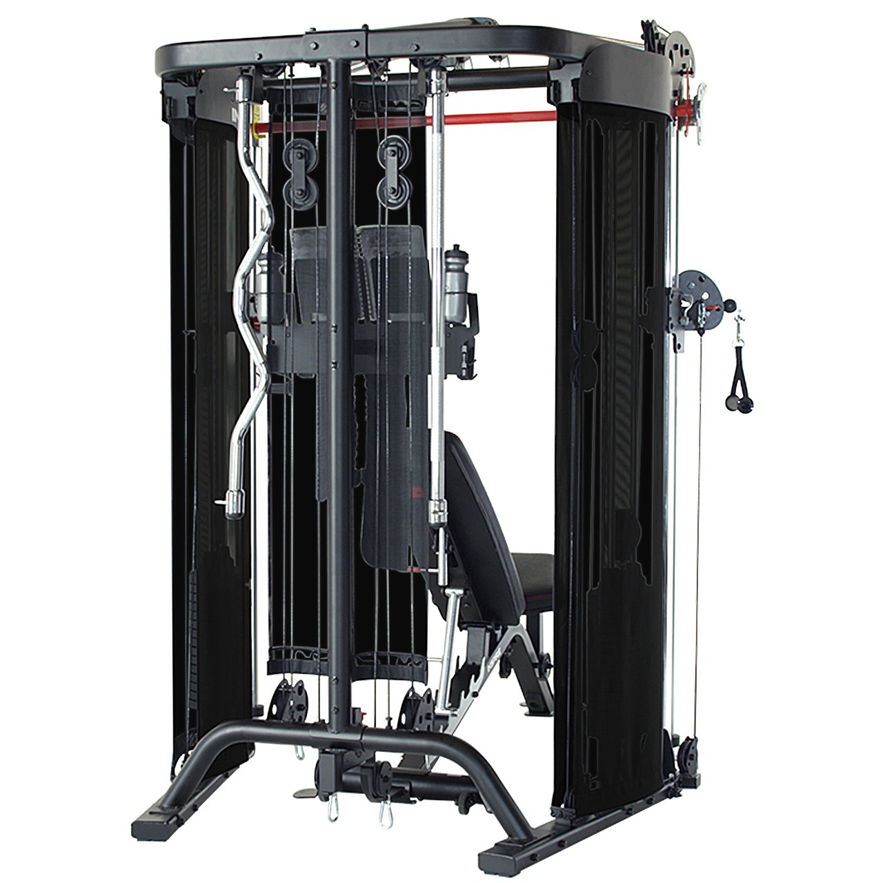 Alle Umlenkrollen arbeiten mit einem Verhältnis von 1:2, wodurch das tatsächliche Gewicht pro Rolle halbiert wird. Bei Nutzung beider Seiten erhalten Sie jedoch den vollen Widerstand. Das Gerät wird inklusive einer integrierten Trainingsbank und umfangreichem Zubehör geliefert, sodass Ihnen sofort alle Trainingsmöglichkeiten offenstehen.