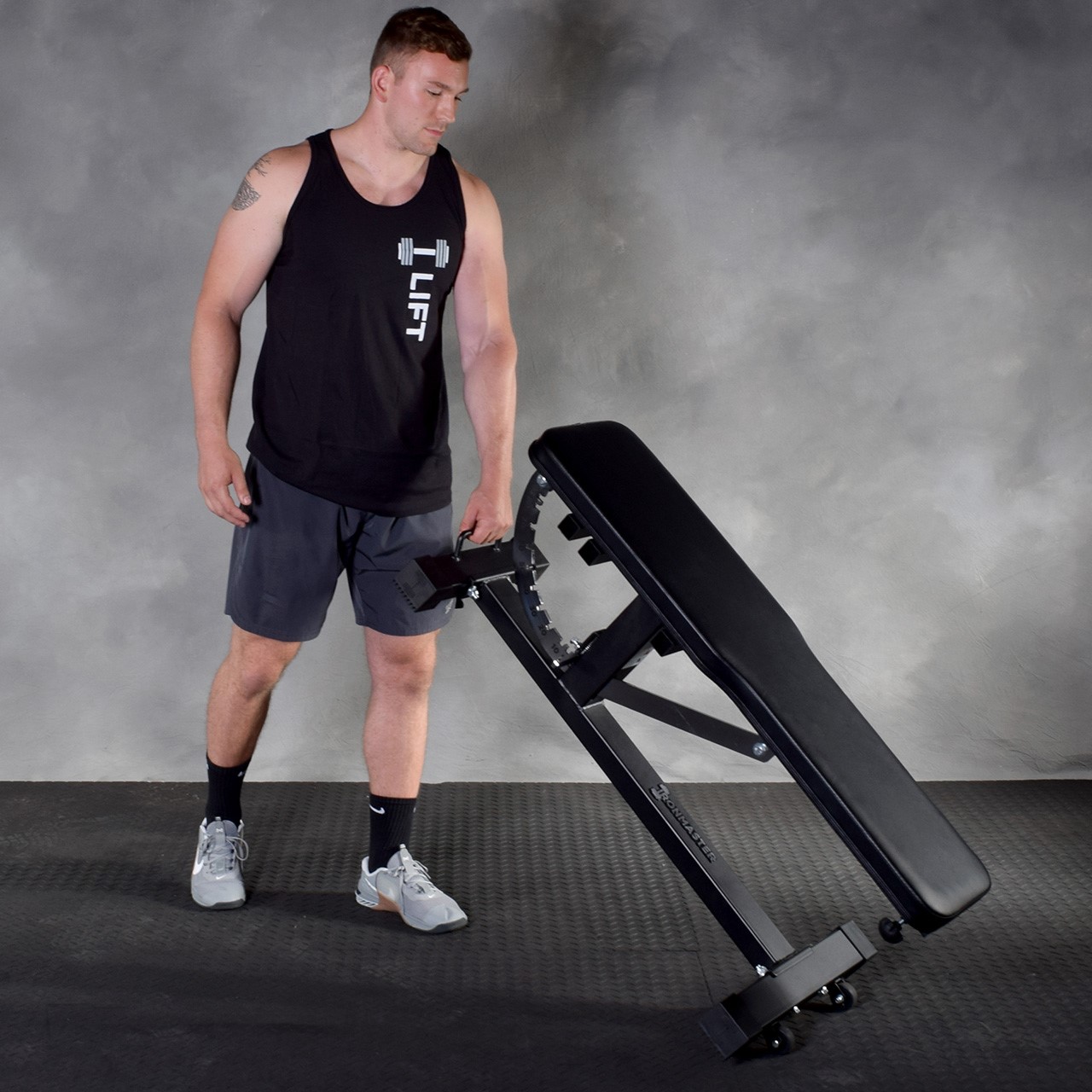 Die Super Bench PRO V2 ist platzsparend, leicht und dank der Transportrollen einfach zu bewegen.