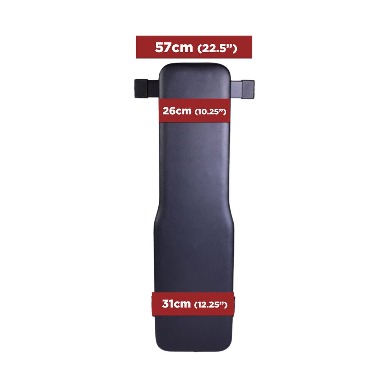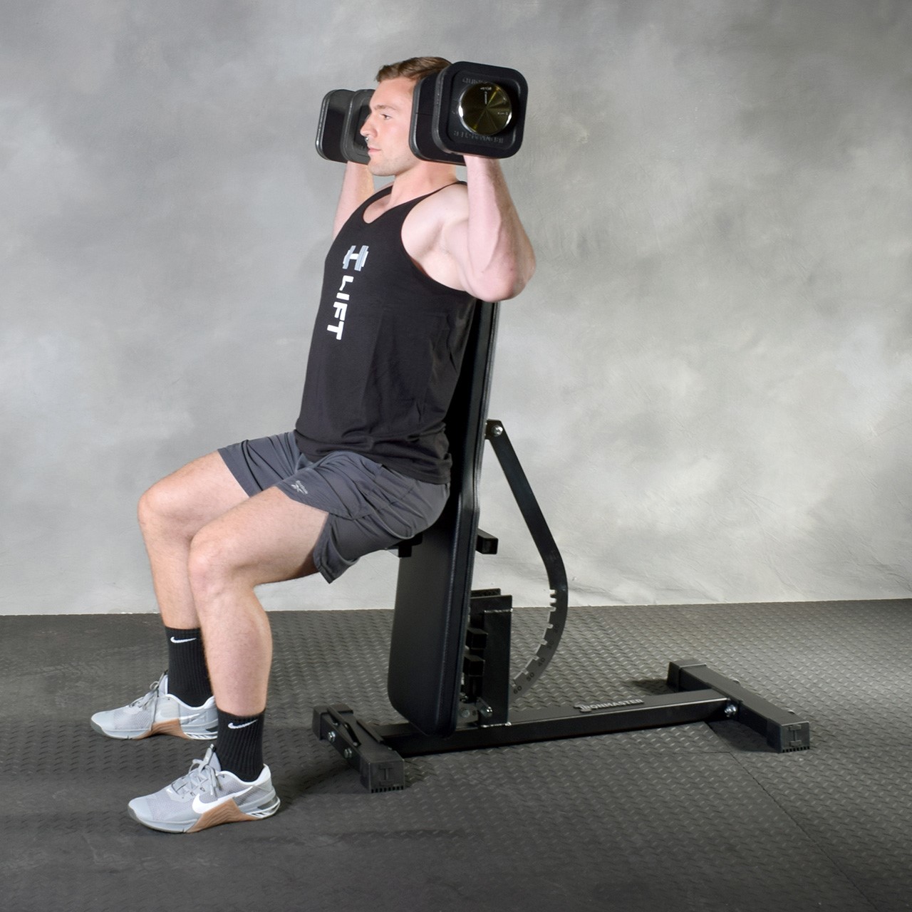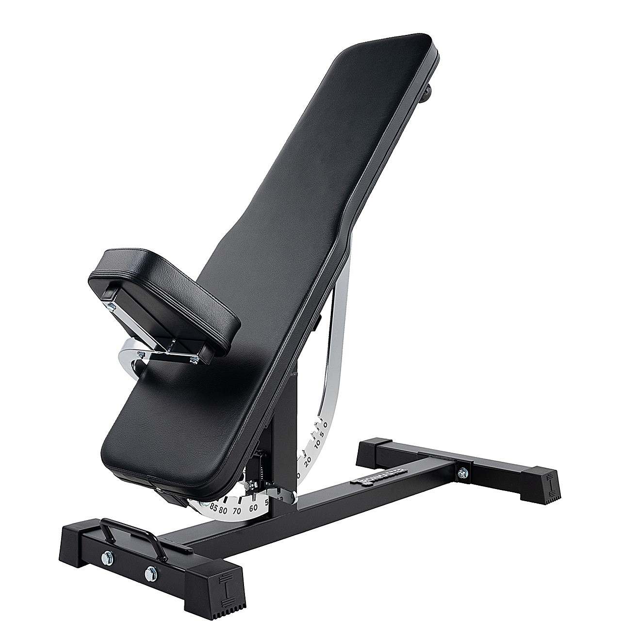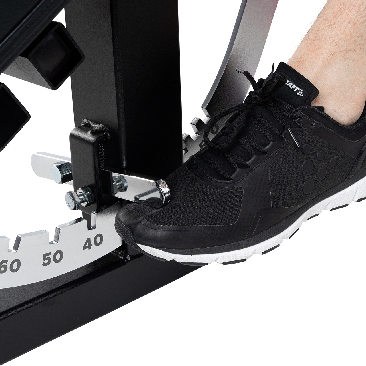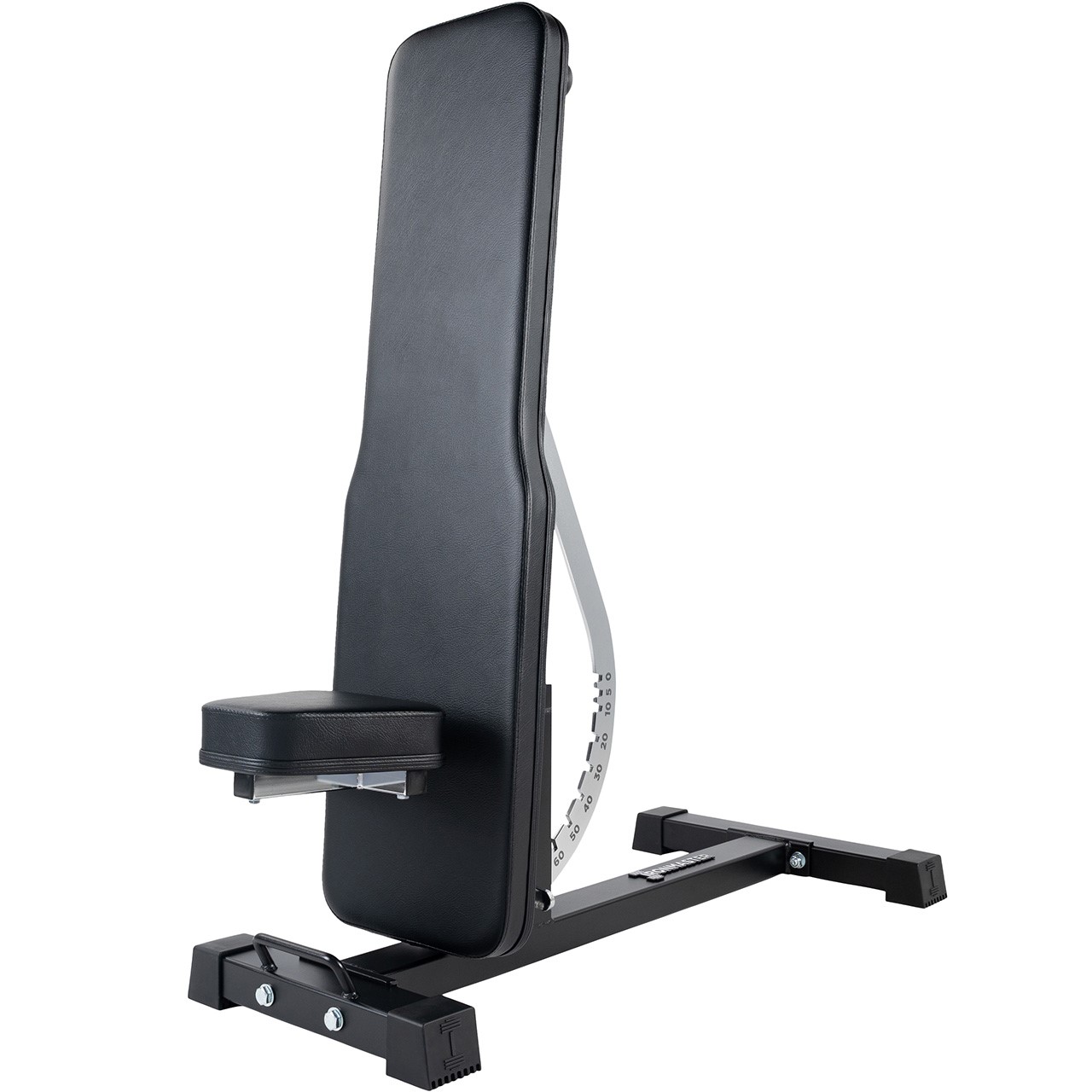 Gefertigt aus starkem Stahl der Stärke 11 und 12, bietet die Bank eine Tragfähigkeit von 450 kg in der flachen Position und 272 kg in der geneigten und aufrechten Position.