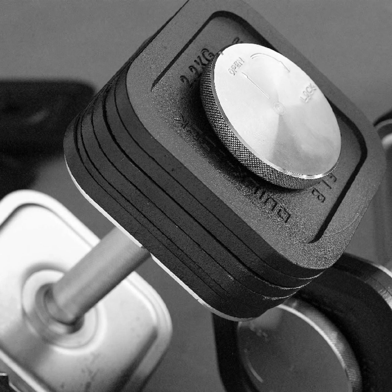 Der Gewichtswechsel ist so einfach, dass er mühelos mit nur einer Hand durchgeführt werden kann. Durch eine 90-Grad-Drehung des Verriegelungsmechanismus löst sich der Sicherungsstift, und die Gewichtsscheiben lassen sich in Sekunden austauschen. So bleiben Ihre Trainingspausen minimal und Ihr Fokus maximal.