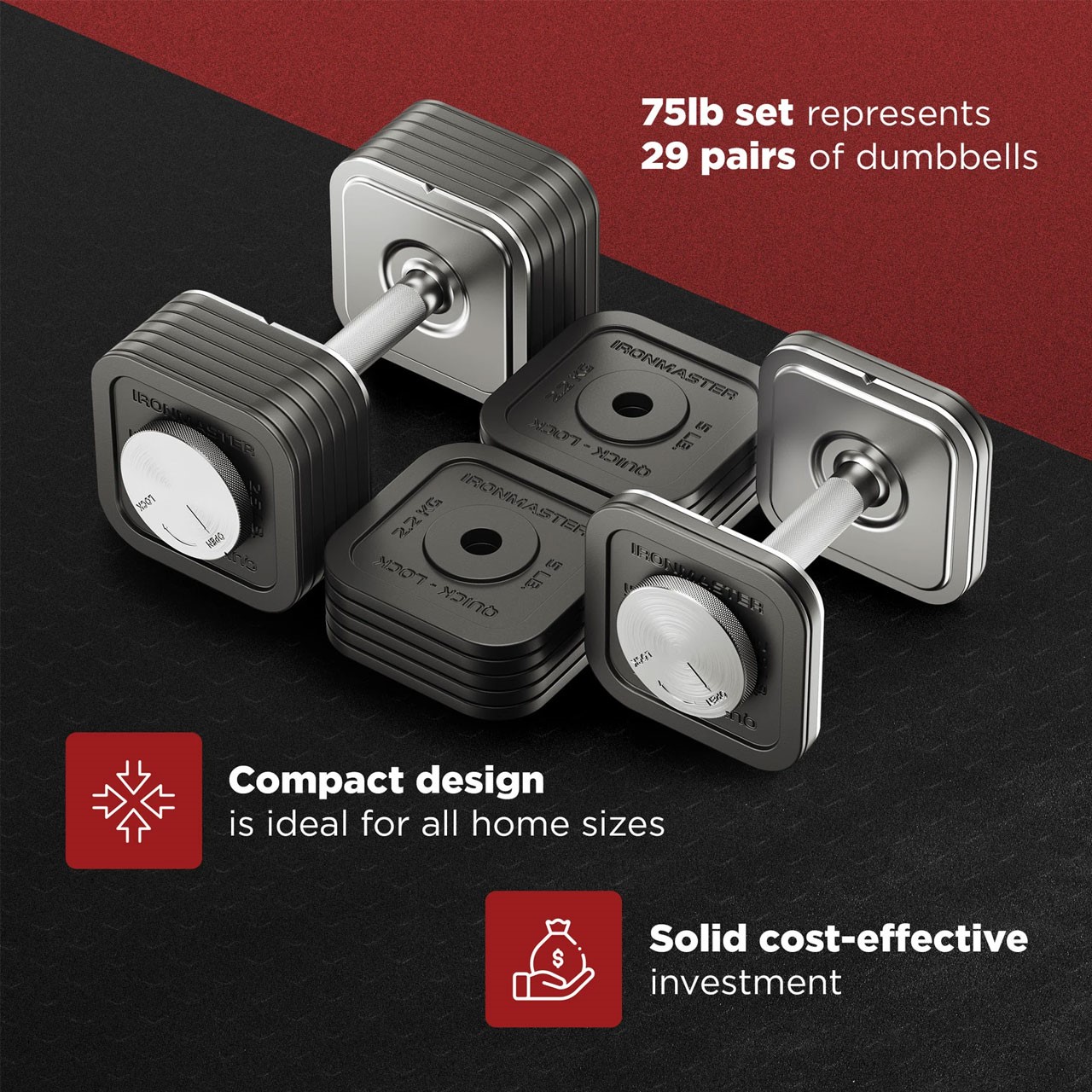 Durch den schnellen Gewichtswechsel und das kompakte, durchdachte Design ersetzt die Ironmaster-Hantel eine ganze Reihe von Kurzhanteln. Das spart nicht nur Platz im Homegym, sondern auch bares Geld – ohne Kompromisse bei Qualität oder Trainingskomfort.