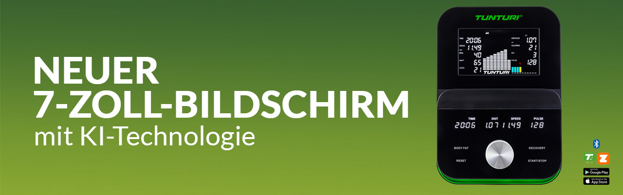 Der neue 7-Zoll-Display zeigt alle Werte übersichtlich an, während Apps wie Tunturi Routes, iConsole+ und Zwift für extra Motivation sorgen.