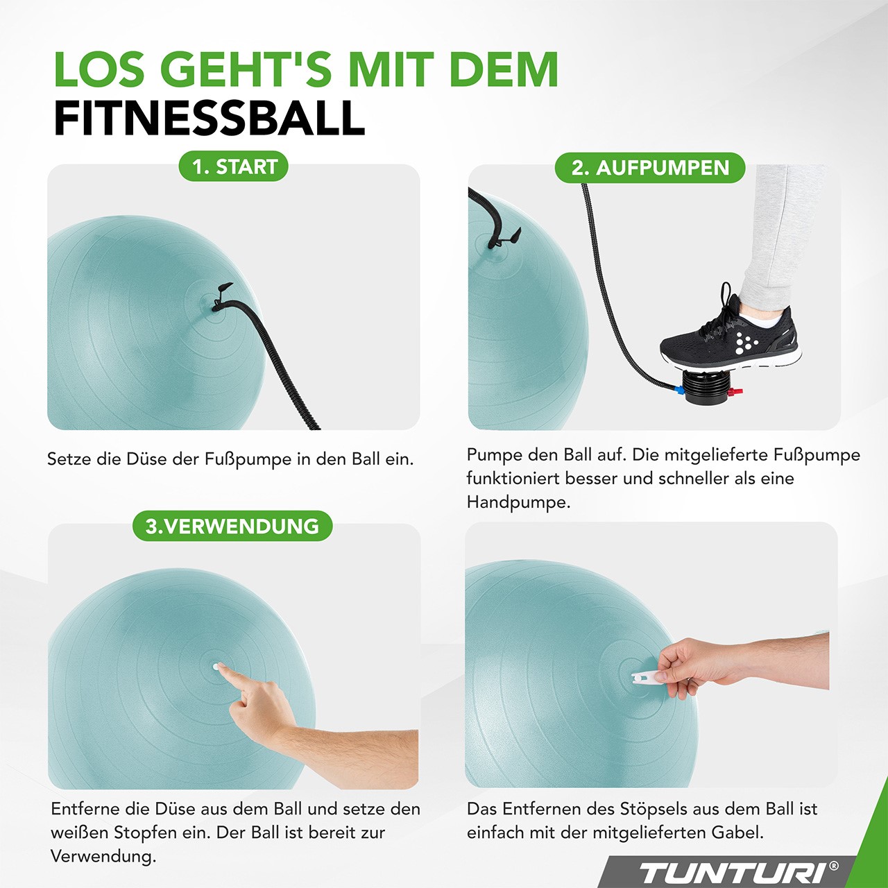 Der Tunturi-Fitnessball ist besonders praktisch in der Anwendung. Dank der im Lieferumfang enthaltenen Ballpumpe, Gabel und Ventile lässt er sich schnell aufpumpen und bei Bedarf leicht entleeren. Das hochwertige Anti-Burst-Material ist nicht nur strapazierfähig, sondern auch pflegeleicht und langlebig.