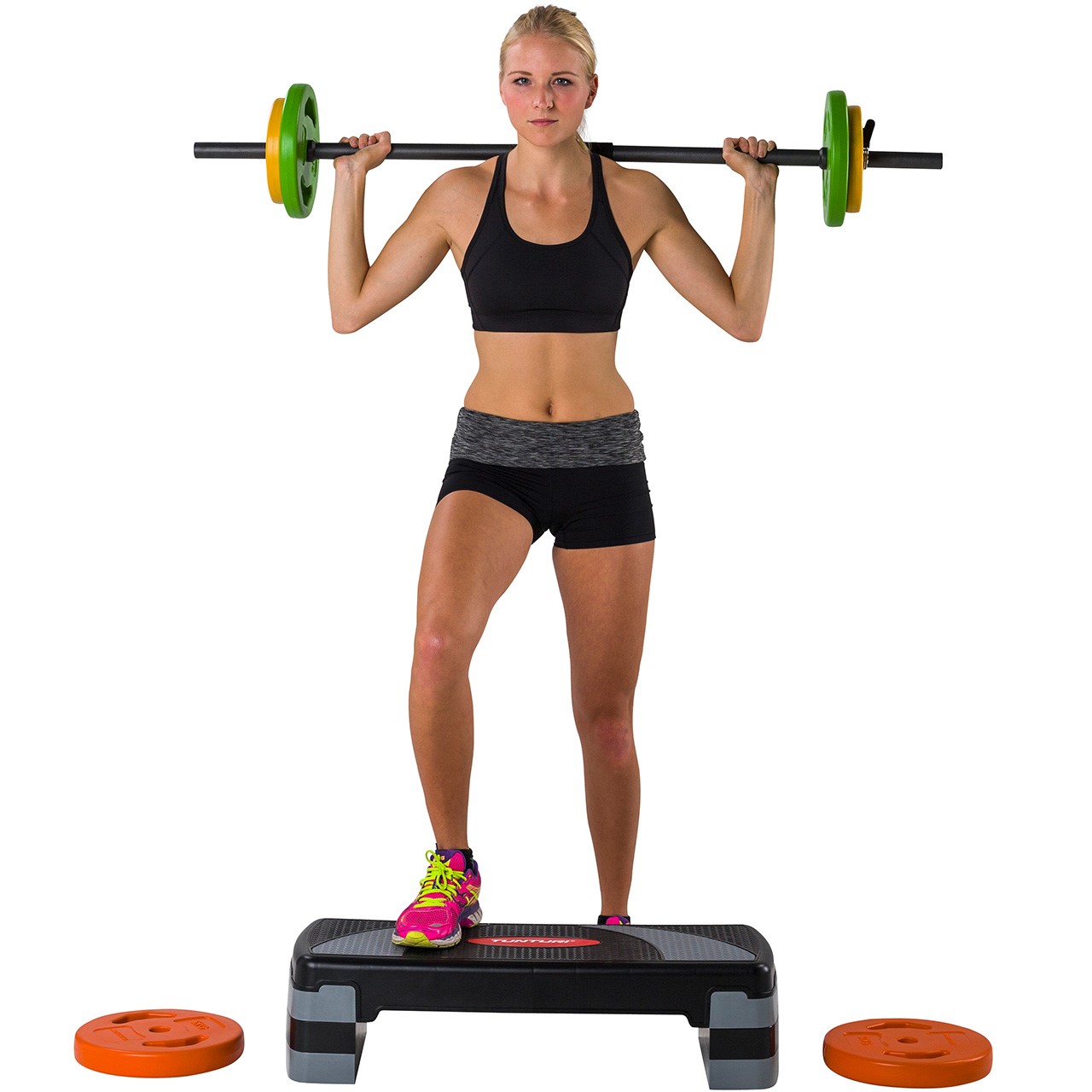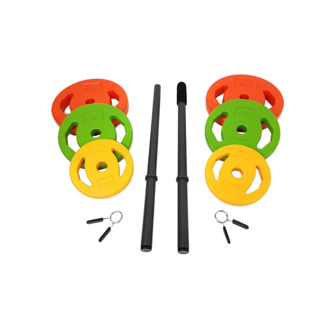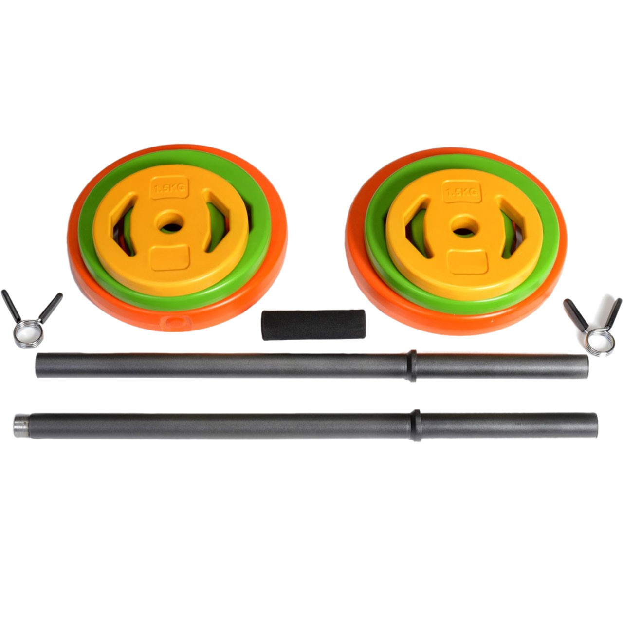 Das Set besteht aus einer stabilen Metallhantelstange mit angenehmer Schaumstoffpolsterung im Nackenbereich sowie 6 farblich codierten Gewichtsscheiben (1.5 kg, 2.5 kg und 5 kg). So lässt sich das Trainingsgewicht individuell und in kleinen Schritten anpassen. Die integrierten Griffe an den Scheiben ermöglichen darüber hinaus den Einsatz ohne Stange für zusätzliche Übungsvarianten.