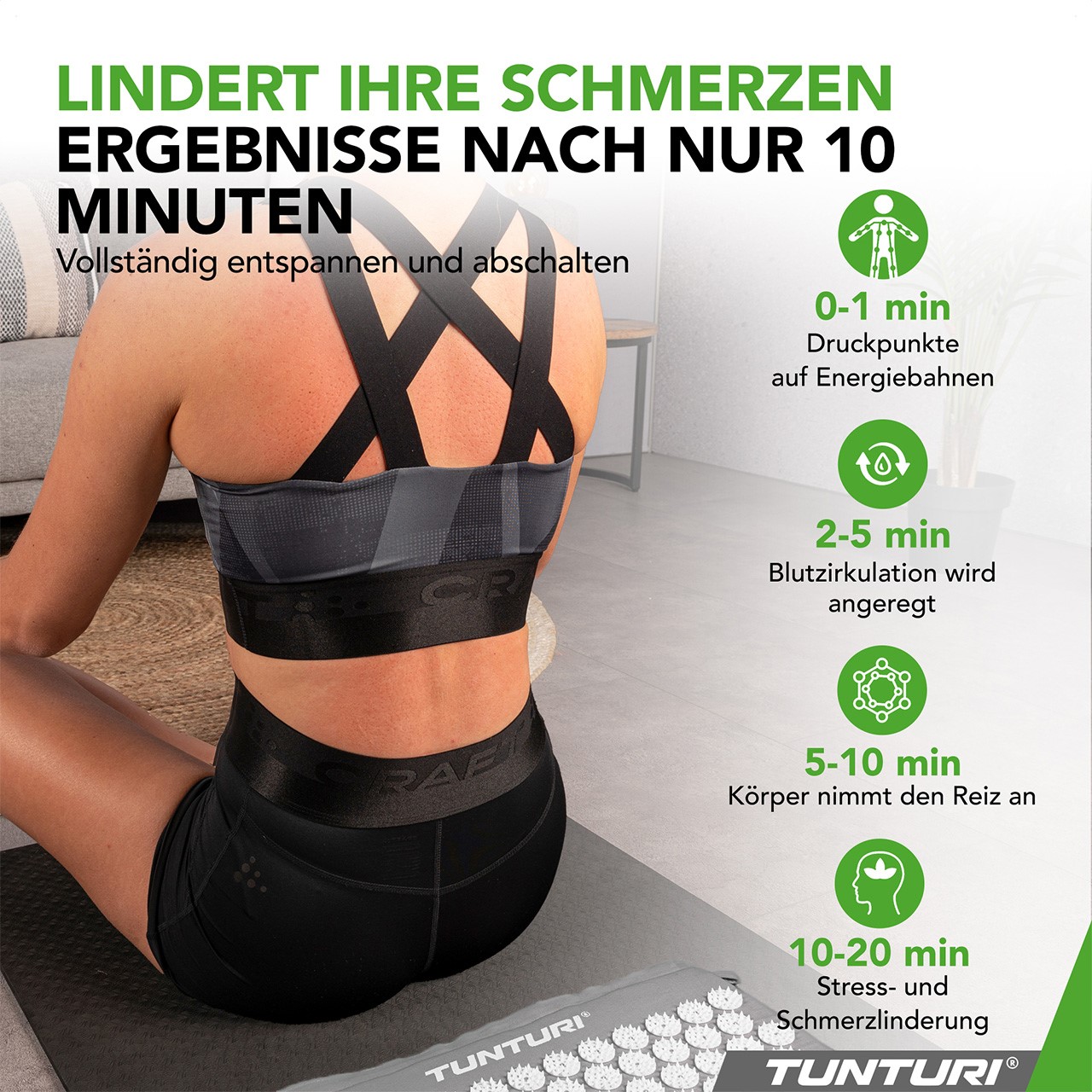 Möchten Sie mehr über die Anwendung der Nadelmatte erfahren? Mit der kostenlosen Tunturi Training App erhalten Sie detaillierte Erklärungen zu den verschiedenen Muskelgruppen und hilfreiche Tipps zu den besten Haltungen. Der integrierte Timer hilft Ihnen, die optimale Zeit für jede Position zu finden. Laden Sie die App kostenlos im App Store oder Play Store herunter und nutzen Sie diese praktische Unterstützung bei Ihrem Training.