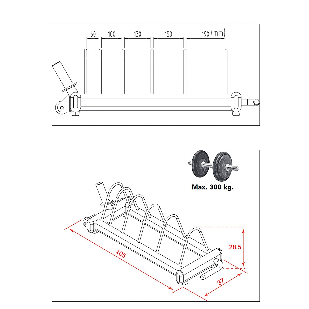 Bietet Platz für: 2 x 5 kg (2.5 x 45 cm), 2 x 10 kg (4.2 x 45 cm),2 x 15 kg (5.5x 45 cm),2 x 20 kg (7.3 x 45 cm),2 x 25 kg (9 x 45 cm)