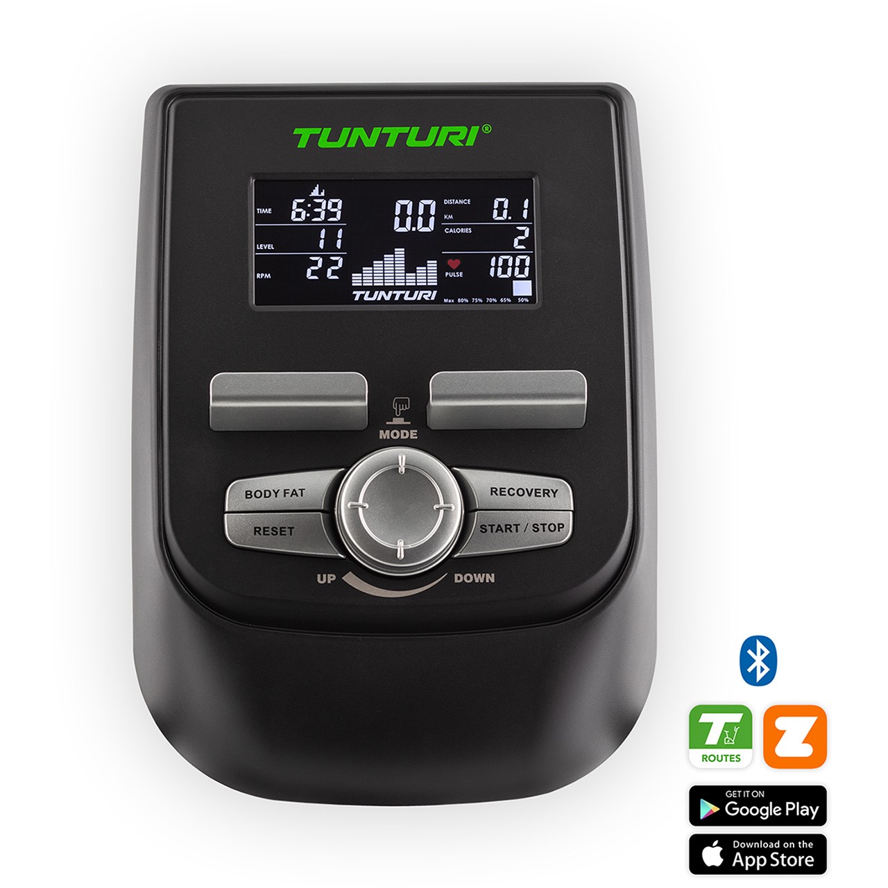 | Apps für Tablets und Smart Phones: | Tunturi Routes, i-Console+, Kinomap & Zwift |