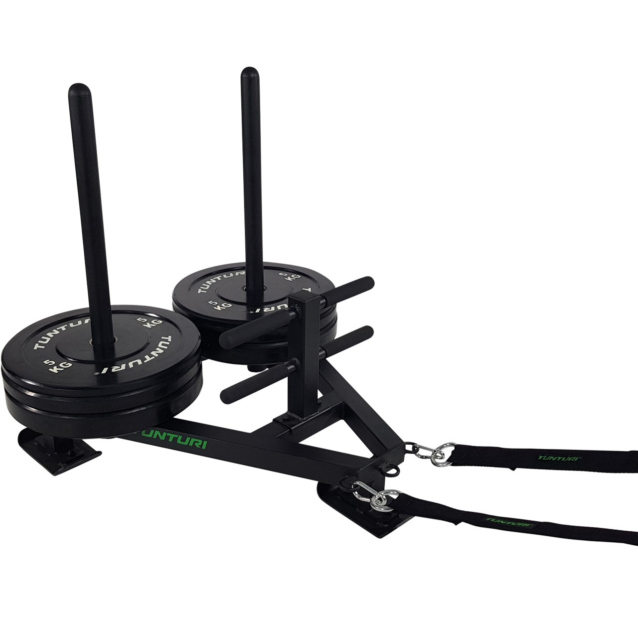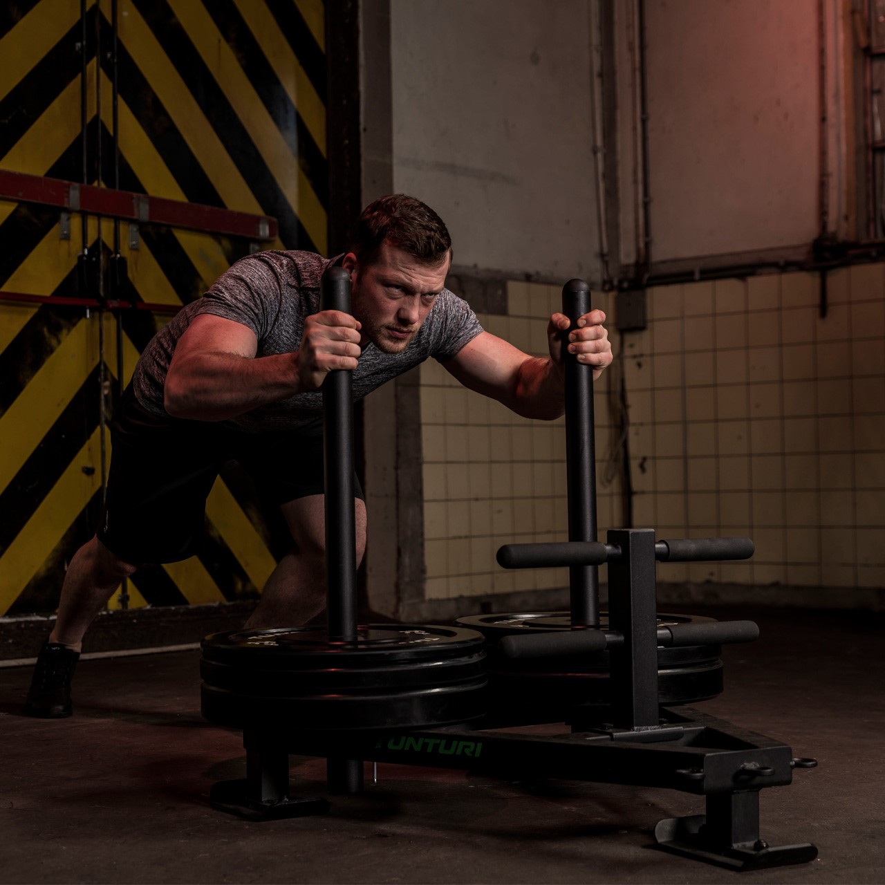 Der Tunturi Gewichtsschlitten (14TUSCF074) eignet sich hervorragend für Konditionstraining, Sprint- und Schnellkrafttraining und beansprucht zudem Beine, Hüften und Arme. Ein optimales Ganzkörpertraining ist also garantiert. Vor allem im Bereich Cross Training wird der Gewichtsschlitten oft verwendet. Er ist aber vielfältig einsetzbar, weil er mit verschieden viel Gewicht bis zu 200 kg bestückt werden kann. Die Gewichtsscheiben zum Beladen sollten einen olympischen Durchmesser von 50 mm aufweisen. Das Eigengewicht des Schlittens beträgt 28 kg. Das Zug-Geschirr (14TUSCF075) muss separat zum Sprintschlitten gekauft werden, ist aber ebenfalls hier im Online Shop erhältlich.