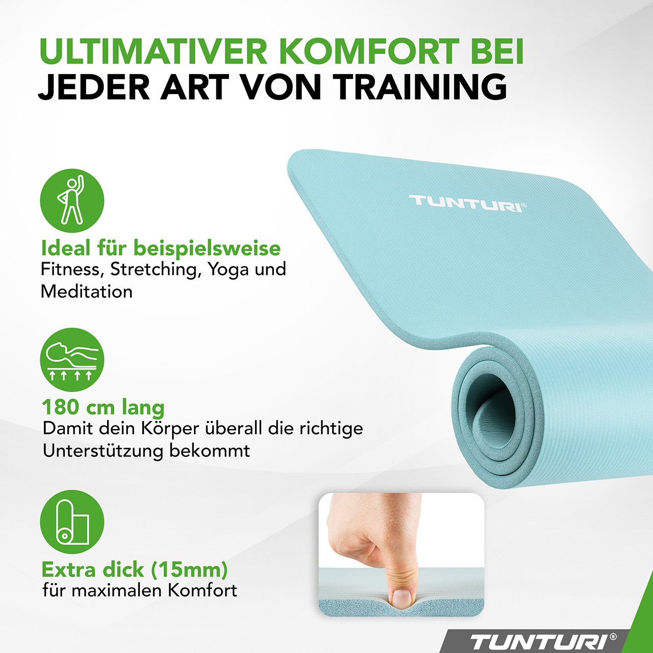 Steigern Sie Ihre Fitness mit der Tunturi NBR-Fitnessmatte, geniessen Sie den Komfort, den Sie für Ihr Training benötigen und verwandeln Sie jede Übung in ein angenehmes Erlebnis!