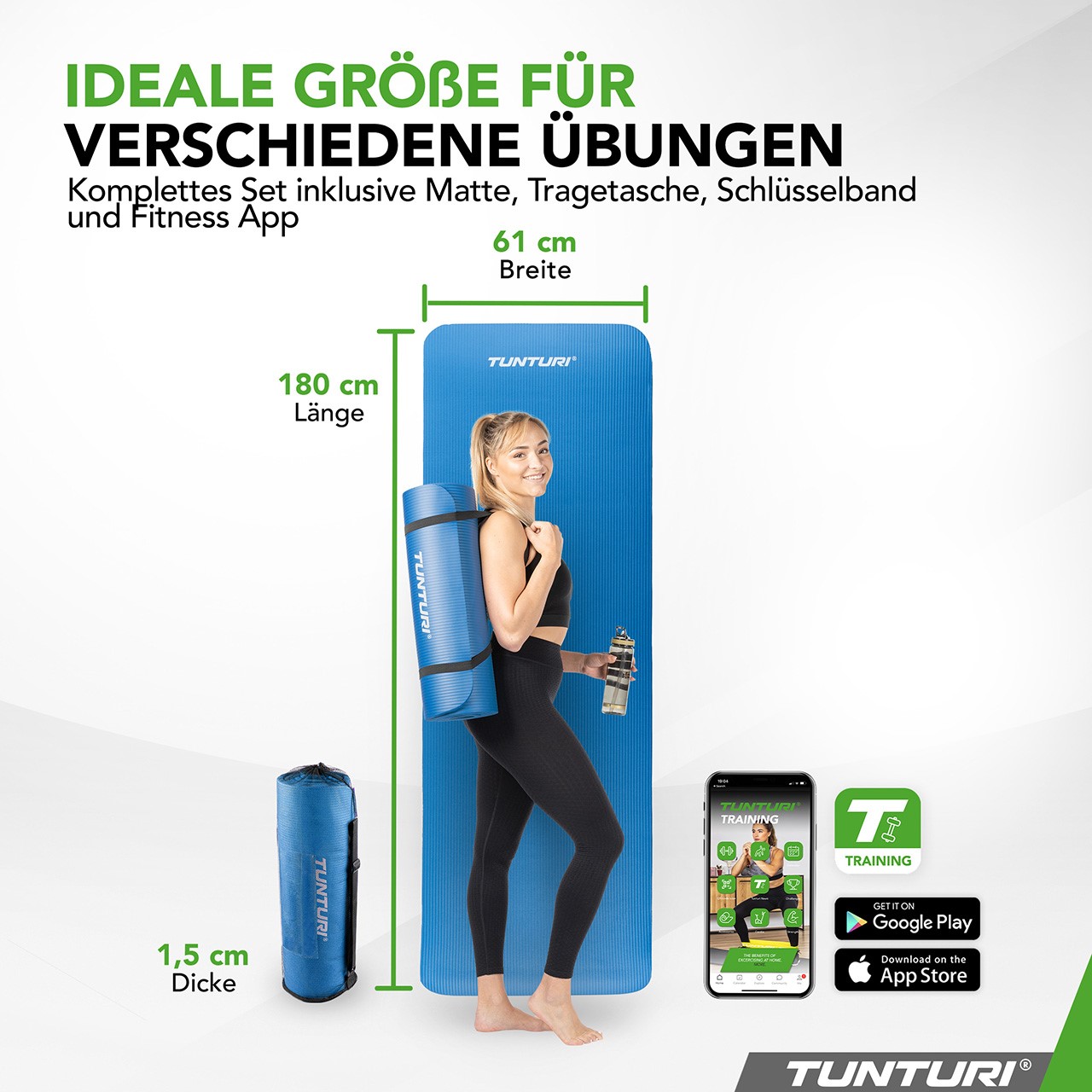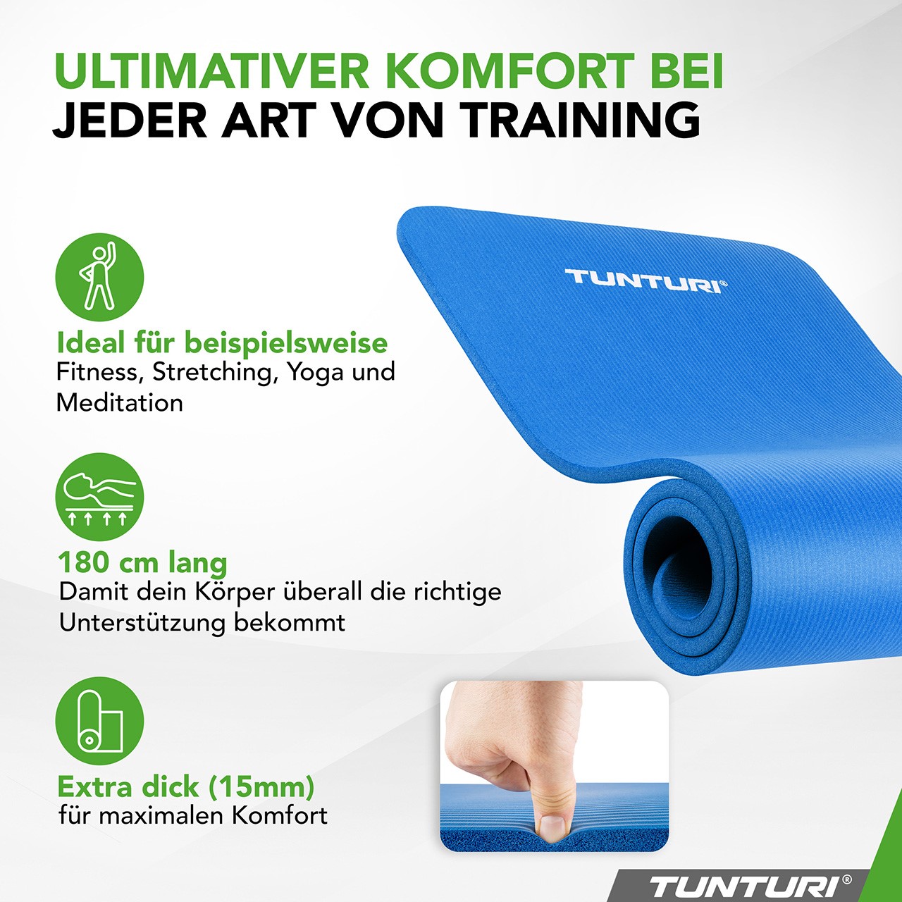 Die Tunturi NBR-Fitnessmatte aus hochwertigem High-Density-Schaum, bietet einzigartigen Komfort und Funktionalität. Mit ihrer grosszügigen Länge von 180 cm, einer Breite von 60 cm und einer Dicke von 1.5 cm ist diese Matte der perfekte Begleiter für Ihr Training, sei es zu Hause oder im Fitnessstudio.