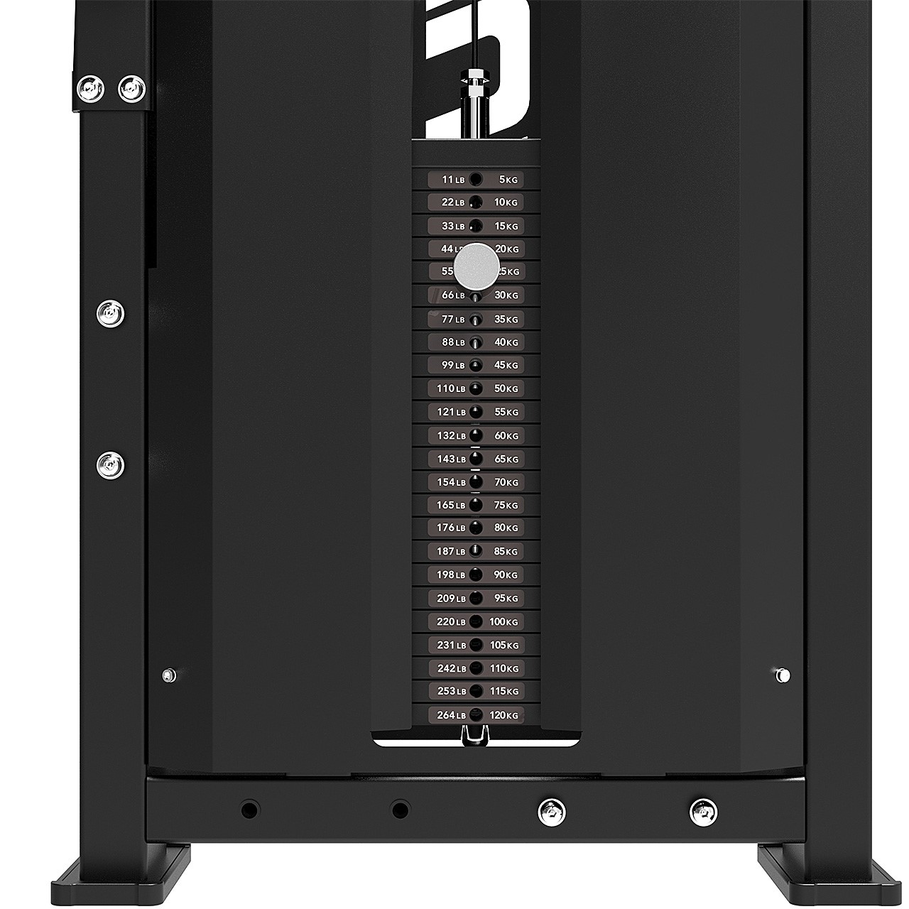 Der Gewichtsstapel mit bis zu 120 kg bietet präzise Abstufungen für ein kontrolliertes und stetiges Training.