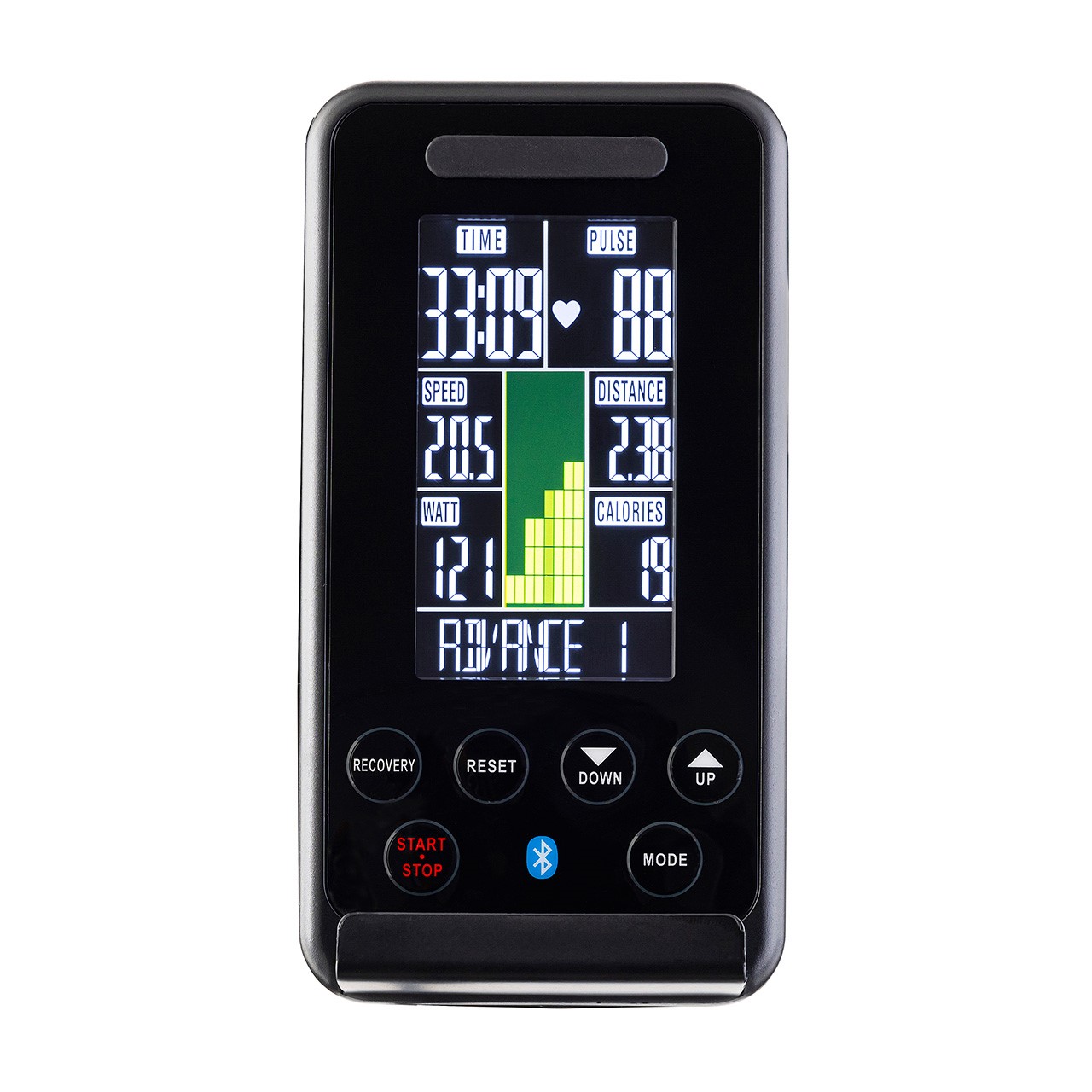 Erleben Sie Präzision und Kontrolle mit dem 5.5-Zoll-LCD-Bildschirm des Platinum SB20 (22PTSB2000). Der neigbare Bildschirm zeigt deutlich Ihre Widerstandsstufe und den Kalorienverbrauch an. Platzieren Sie Ihr Tablet oder Smartphone in der Halterung und wählen Sie mühelos zwischen 32 Widerstandsstufen. Mit der schnellen manuellen Steuerung über den Drehknopf stellen Sie den Widerstand stufenlos ein – perfekt für dynamische Workouts.