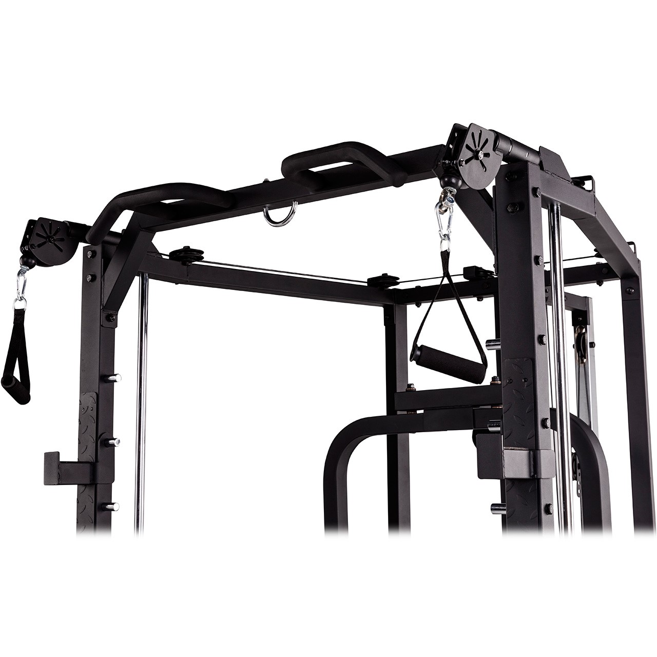 Die frei beweglichen Butterfly-Griffe fügen sich perfekt in Ihre Trainingsroutine ein und ermöglichen es Ihnen, verschiedene Muskelgruppen effektiv zu trainieren. Mit der integrierten Hantelscheibenablage haben Sie stets alles griffbereit und können Ihr Training bestens organisiert durchführen (Gewichtsscheiben nicht enthalten). Nutzen Sie die Klimmzuggriffe für intensive Pull-ups oder Chinnings, stärken Sie mit den Pulleys gezielt Butterfly, Bizeps und Trizeps oder setzen Sie Langhanteln für ein umfassendes Krafttraining ein. Zusätzlich lässt sich dieses vielseitige Heimfitnessstudio mit weiterem Zubehör erweitern – auch für TRX-Training steht Ihnen ein praktischer Aufhängehaken zur Verfügung, um Ihre Übungen noch abwechslungsreicher zu gestalten.