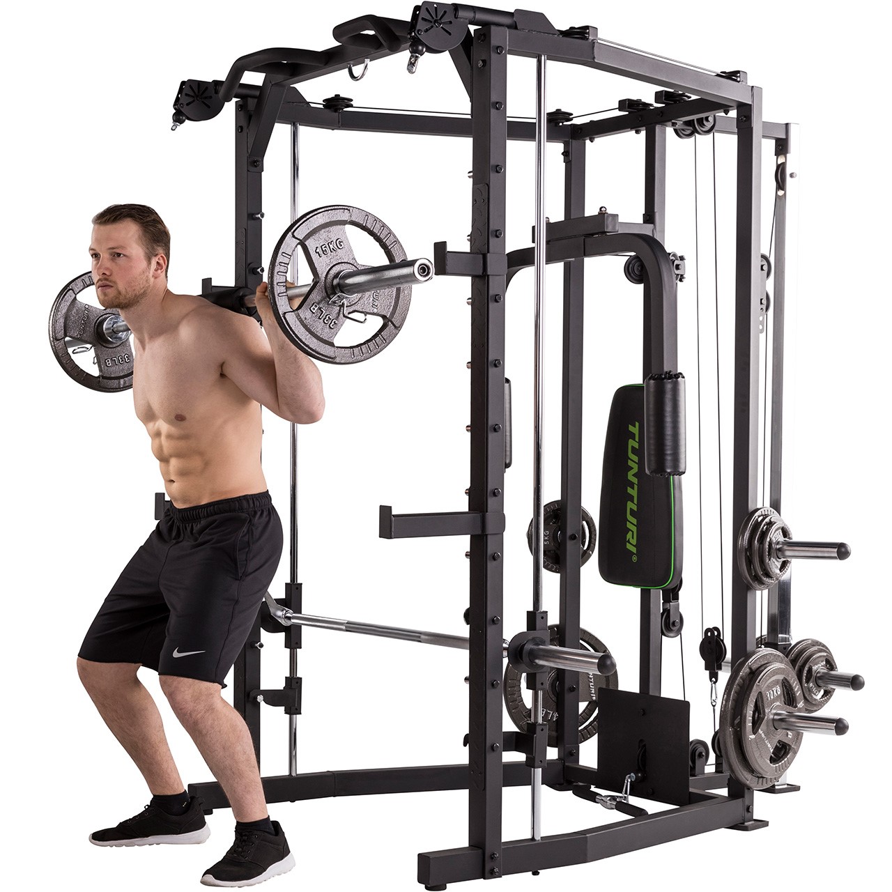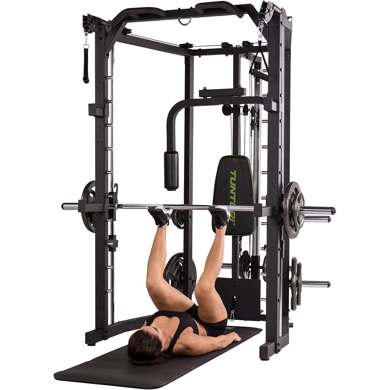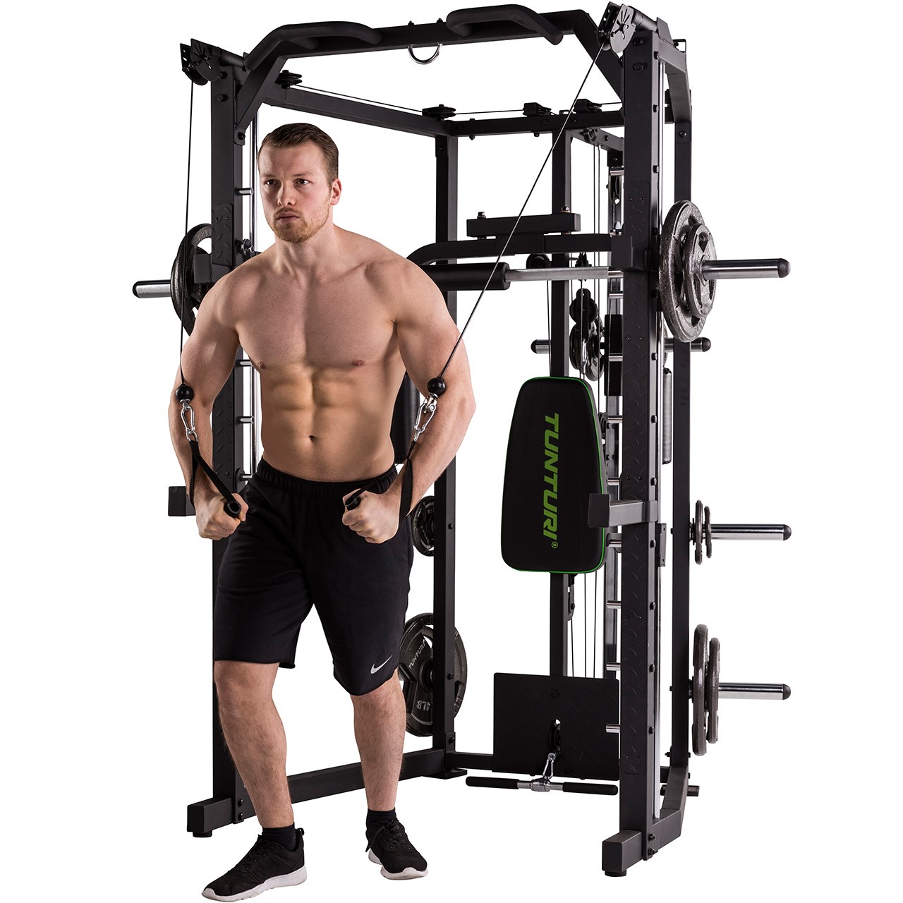 Die Tunturi SM80 Kraftstation (17TSSM8000) ist mehr als nur eine einfache Kraftstation – dieses All-in-One-Gerät ist ein Deluxe Smith Cage mit integriertem Cable Cross, das ein beeindruckend vielseitiges Trainingsspektrum bietet. Perfekt für nahezu alle Langhantelübungen, ermöglicht die SM80 ein gezieltes und effektives Muskelaufbautraining. Trainieren Sie gezielt verschiedene Muskelgruppen und bauen Sie Ihre Muskulatur auf. Ob drückende oder ziehende Bewegungen wie Schrägbankdrücken, Negativbankdrücken, Nackendrücken, Kniebeugen oder Rudern – diese Multipresse bietet die ideale Lösung für ein vielseitiges und intensives Home Workout.