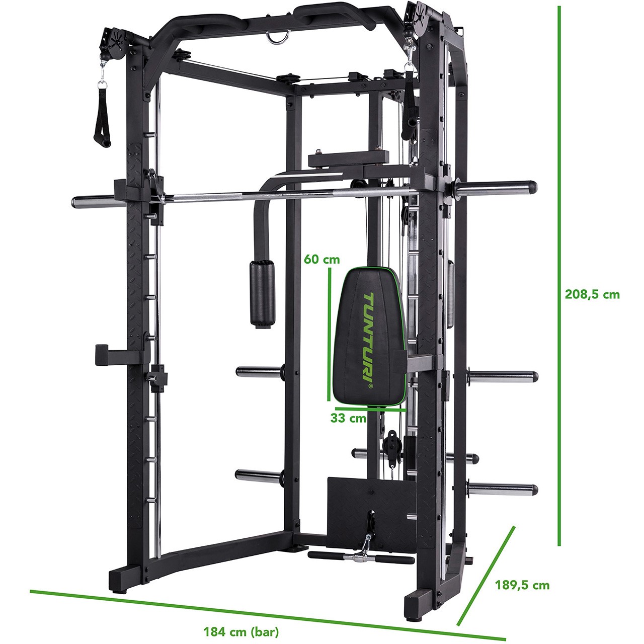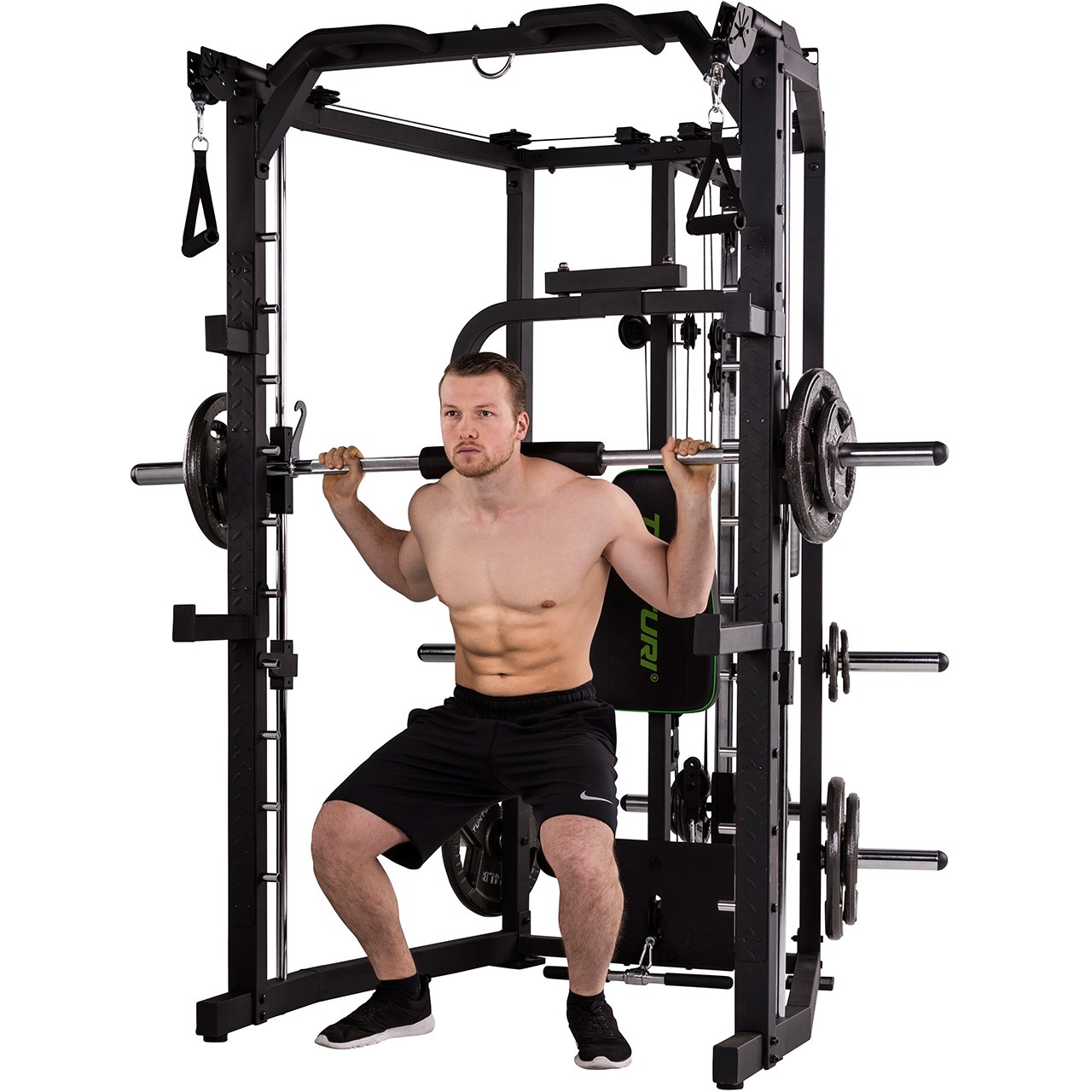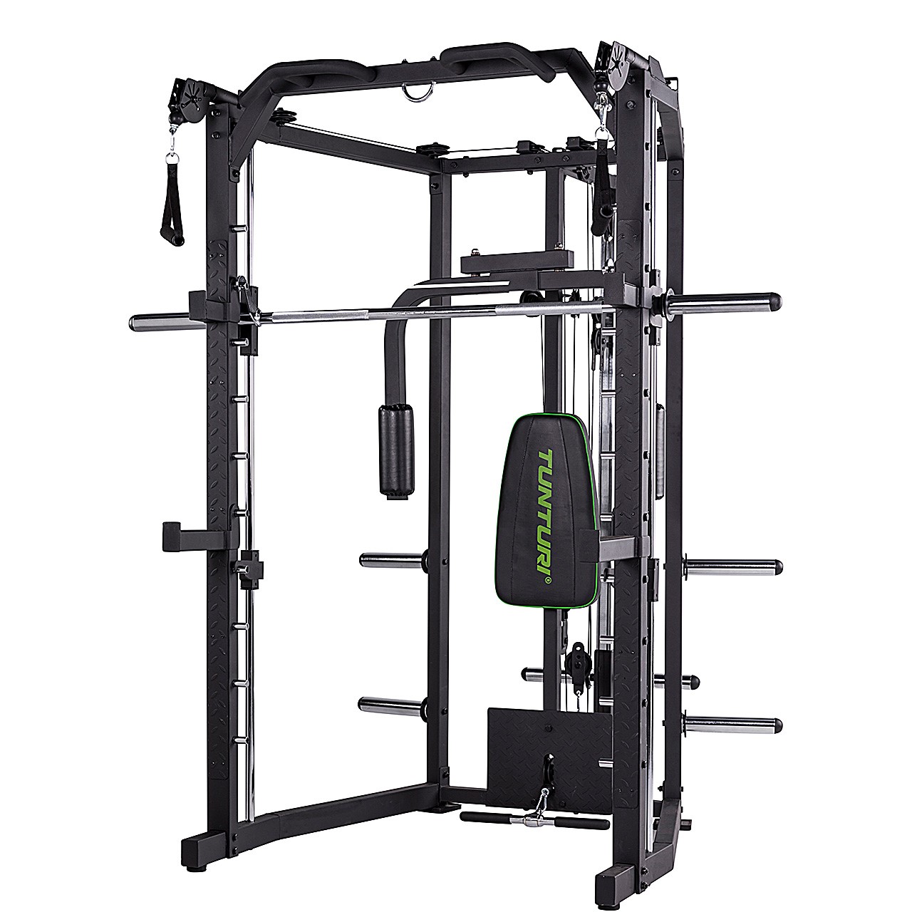 Die Tunturi SM80 Kraftstation (17TSSM8000) ist mehr als nur eine einfache Kraftstation – dieses All-in-One-Gerät ist ein Deluxe Smith Cage mit integriertem Cable Cross, das ein beeindruckend vielseitiges Trainingsspektrum bietet. Perfekt für nahezu alle Langhantelübungen, ermöglicht die SM80 ein gezieltes und effektives Muskelaufbautraining. Trainieren Sie gezielt verschiedene Muskelgruppen und bauen Sie Ihre Muskulatur auf. Ob drückende oder ziehende Bewegungen wie Schrägbankdrücken, Negativbankdrücken, Nackendrücken, Kniebeugen oder Rudern – diese Multipresse bietet die ideale Lösung für ein vielseitiges und intensives Home Workout.