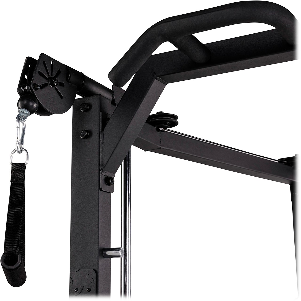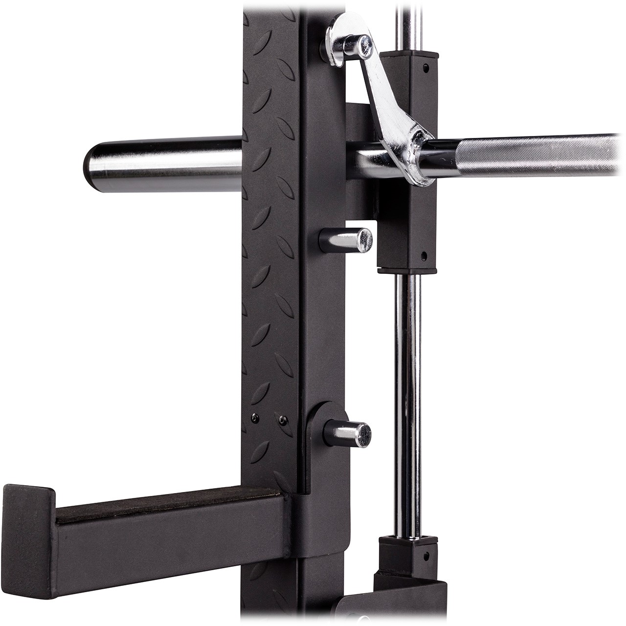 Die geführte Hantelstange und die einstellbaren Absturzsicherungen sorgen für maximale Sicherheit beim Training, auch bei schweren Gewichten. Mit den flexiblen Zugkabeln, die sich unabhängig voneinander bewegen, können Sie verschiedene Übungen durchführen. Das Crossover-Design und die integrierte Fussplatte ermöglichen zudem sichere Ruderübungen. Die Hantelstange ist so gestaltet, dass Sie sowohl 30 mm als auch 50 mm Hantelscheiben nutzen können. Hierfür müssen Sie nur die schwarze Kappe an den Seiten entfernen und den 50 mm Adapter abschrauben.