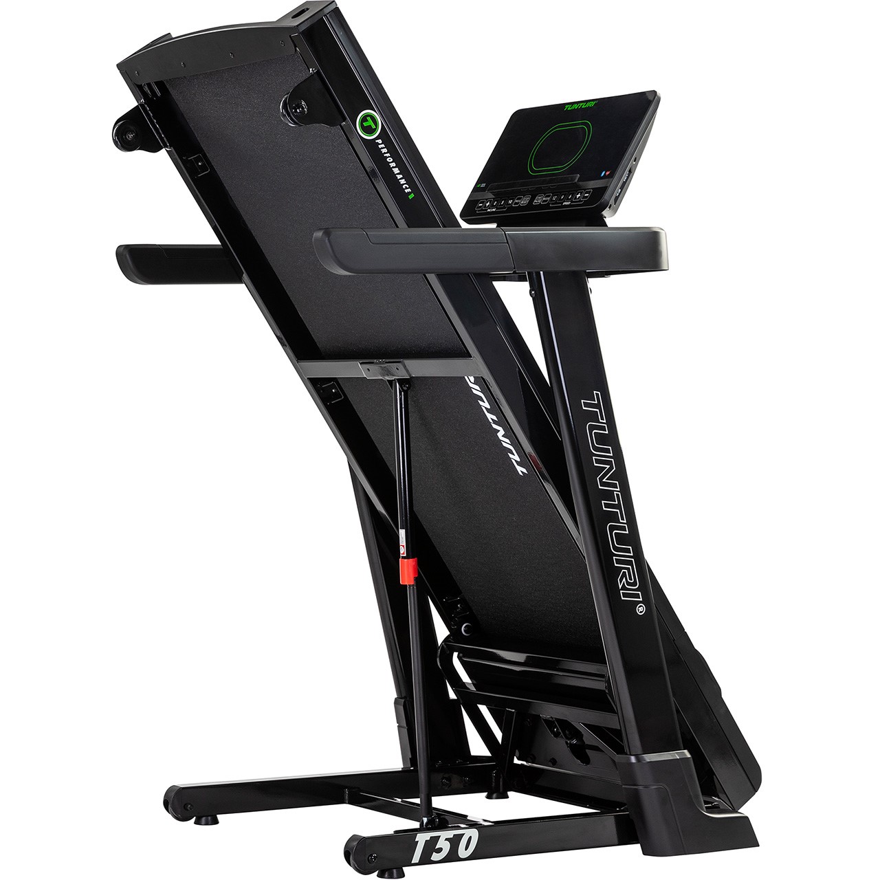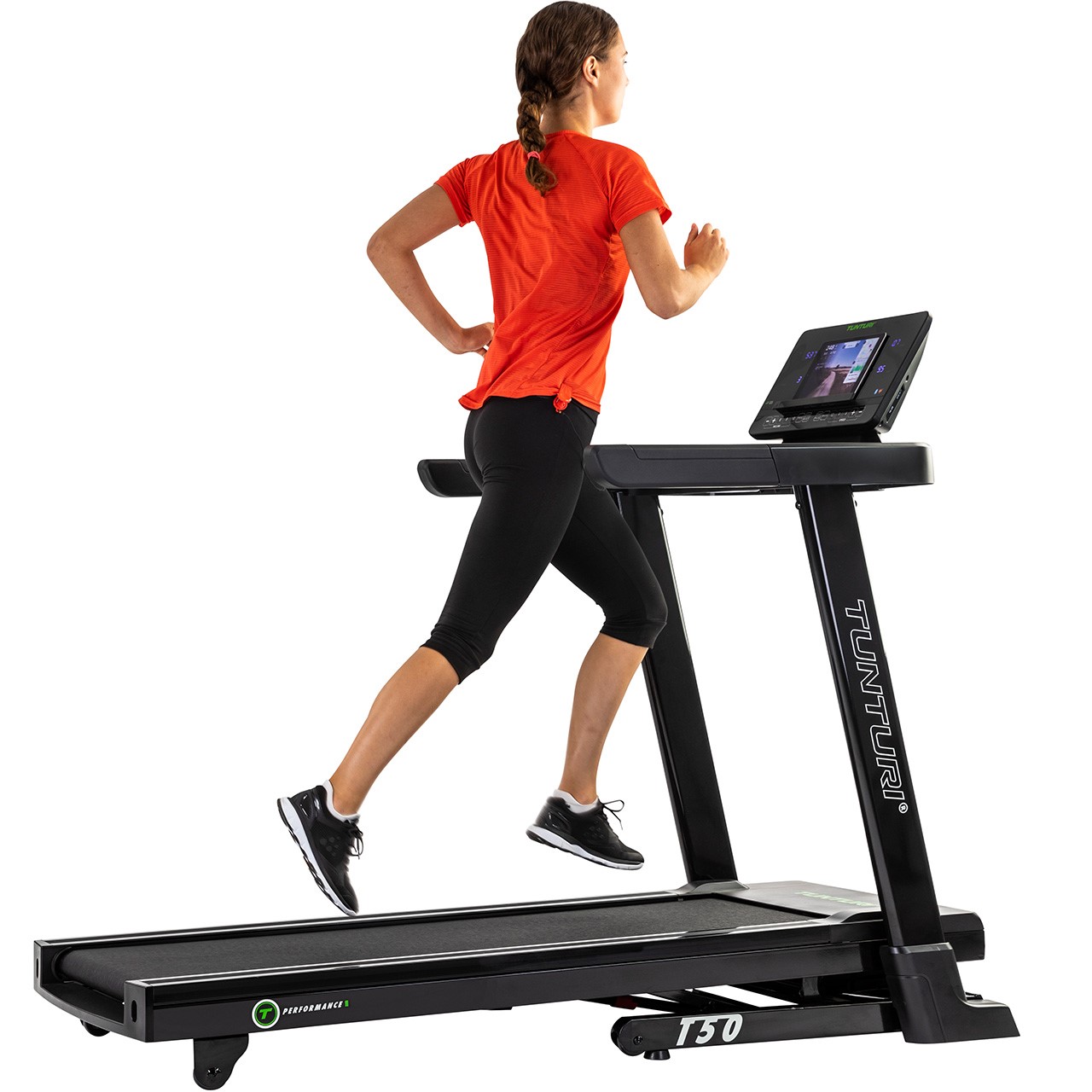 Das Performance Laufband bietet eine grosszügige Lauffläche von 140 x 50 cm, die dank des innovativen Tunturi T-FLEX COMFORT PLUS Laufdecksystems optimal gefedert ist. Es kann durch die Klappfunktion kinderleicht verstaut werden und eignet sich dadurch auch für kleinere Wohnräume.