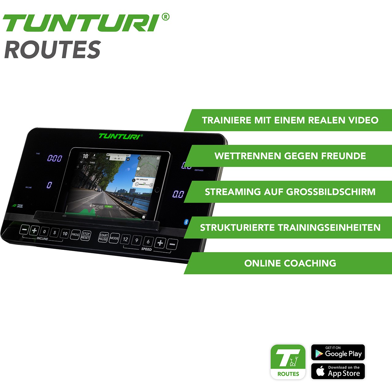 | Apps für Tablets und Smart Phones: | Tunturi Routes, Anyrun, Kinomap & Zwift |