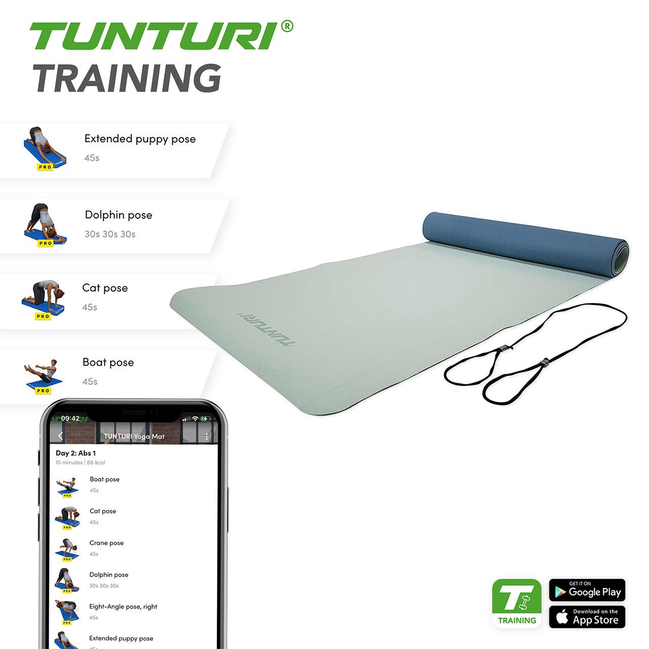 Tunturi stellt den optimalen Yoga-Ritual-Helfer vor: Die TPE Yogamatte 14TUSYO033. Sie ist rutschfest und somit ideal für eine ausgiebige Yoga-Session. Die Yogamatte wurde speziell von Tunturi mit zwei verschiedenen Texturen produziert, um die Anti-Rutsch-Eigenschaft zu erlangen. Das Material ist TPE, welches zu 100% recyclebar ist. Die ungefähren Abmasse der Yogamatte betragen 183 x 61 (LB in cm). Die Matte ist 4 mm dick und kommt mit einer elastischen Kordel, damit man diese nach dem Training zusammenbinden und verstauen kann.