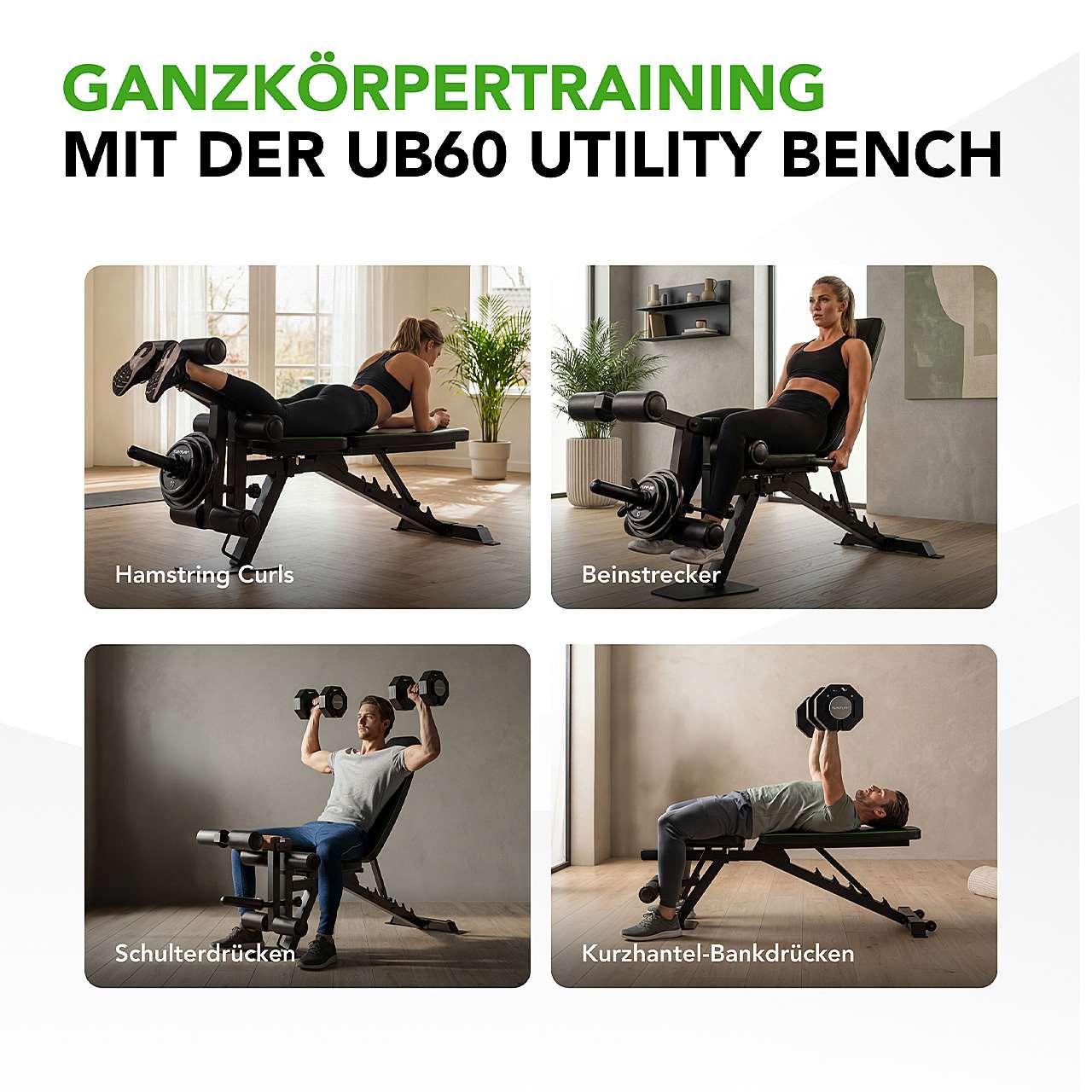 Die UB60 ist eine multifunktionale Hantelbank, mit der Sie zahlreiche Kraftübungen ausführen können. Die Rückenlehne lässt sich in 6 Positionen einstellen (-27°, 0°, 20°, 37°, 52°, 70°), während die Sitzfläche 4 Positionen bietet (0°, 5°, 10°, 15°). So wechseln Sie problemlos zwischen Flat-, Incline- und Decline-Übungen. Ideal für Dumbbell Bench Press, Shoulder Press, Bizeps-Curls oder diverse Core-Übungen.