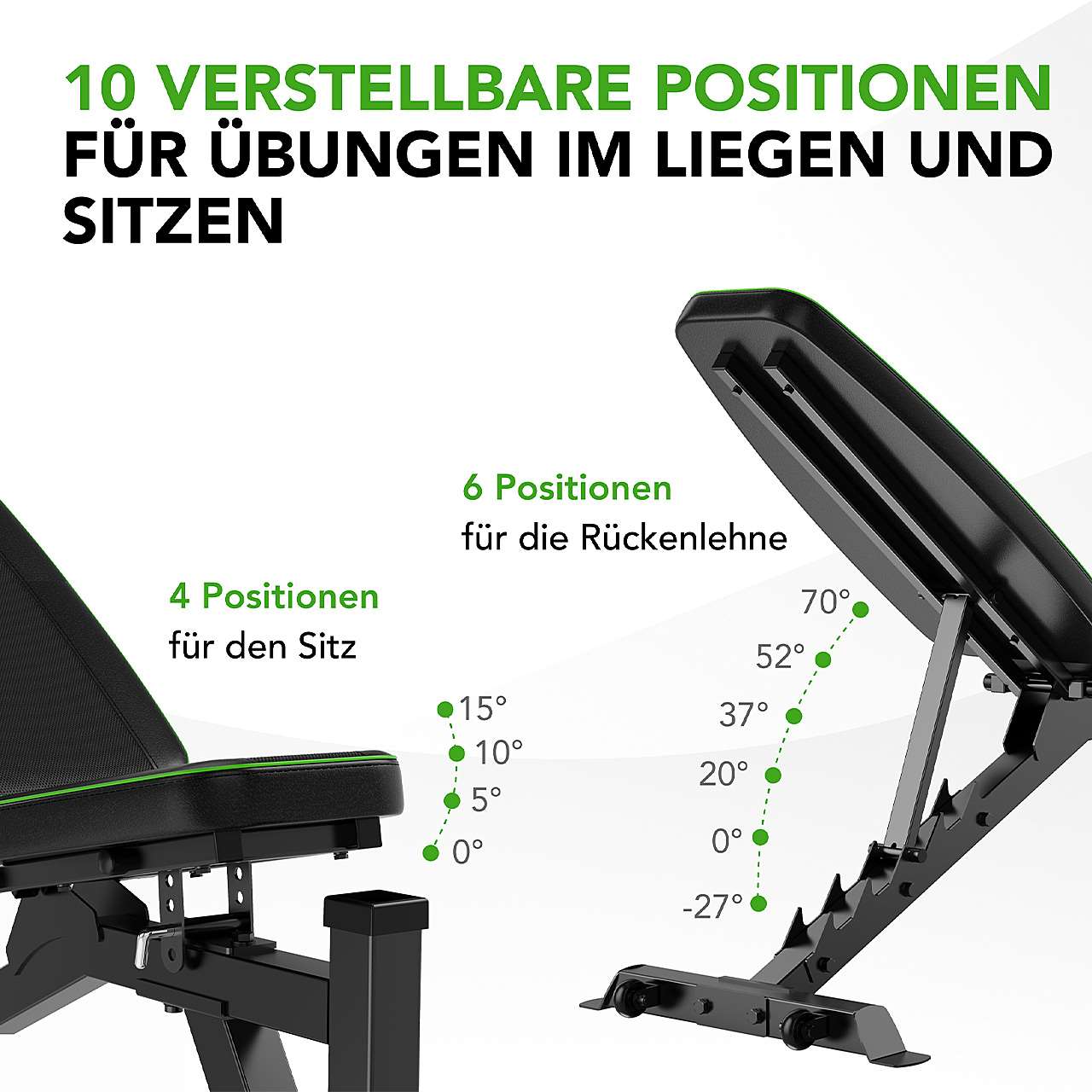 Rückenlehne verstellbar von Decline bis Incline (-27° bis 70°)