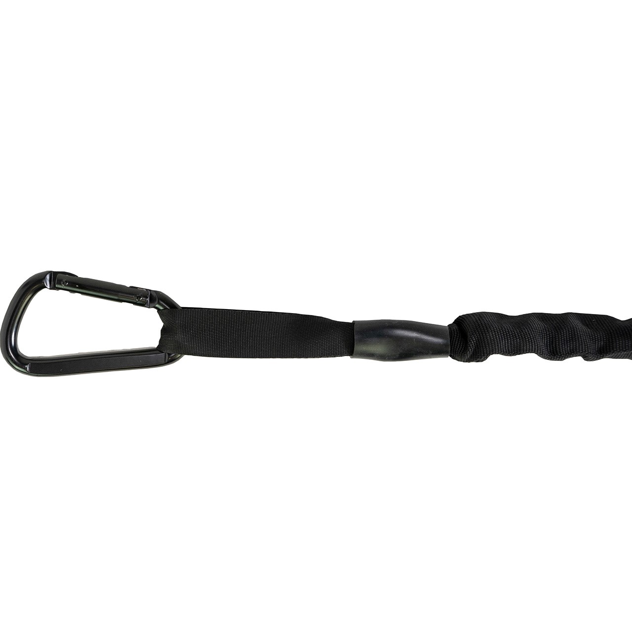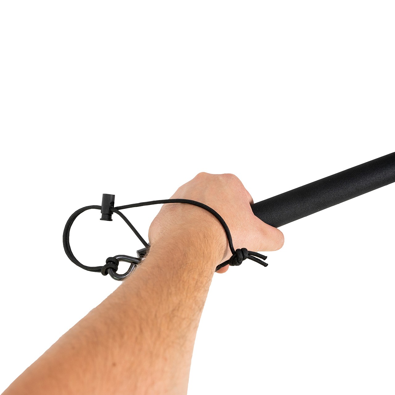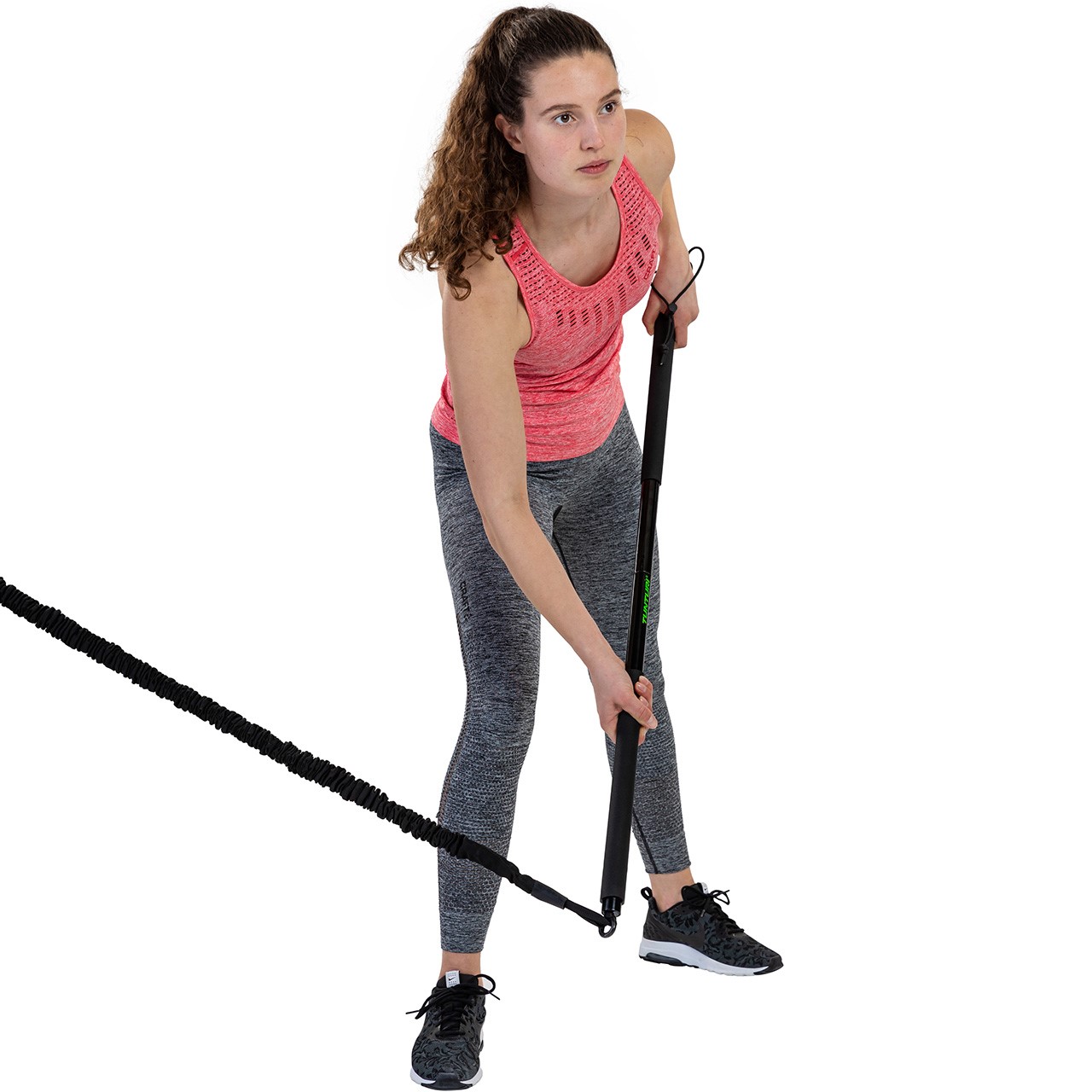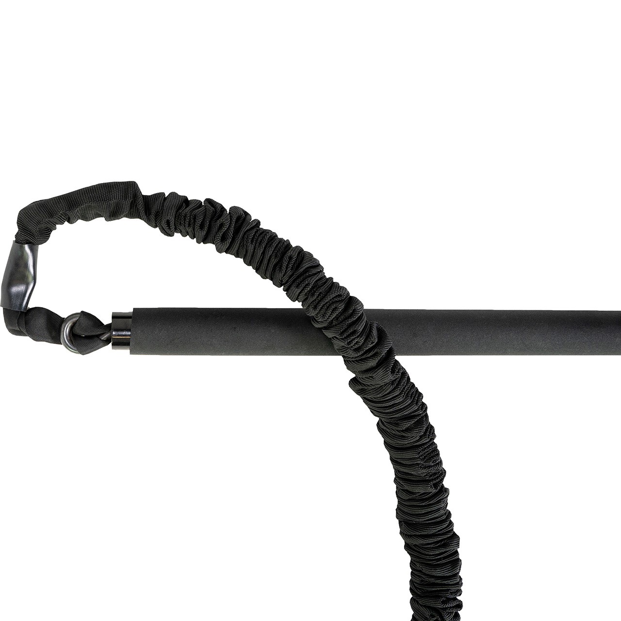 Das Set besteht aus dem zweiteiliegen Stahlstab, dem Bungee Widerstandsseil, einem Karabinerhaken und einer Nylon Tragtasche. Das Gesamtgewicht beträgt 1.8 kg.