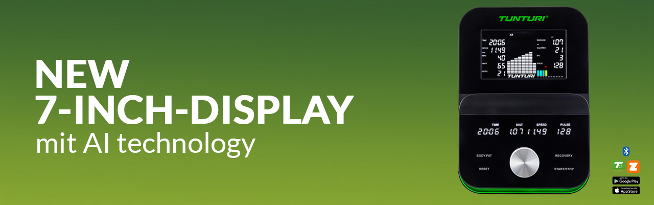 The new 7-inch Bluetooth AI monitor keeps all your training data in view and allows interactive workouts with apps like Tunturi Routes, iConsole+, or Zwift.