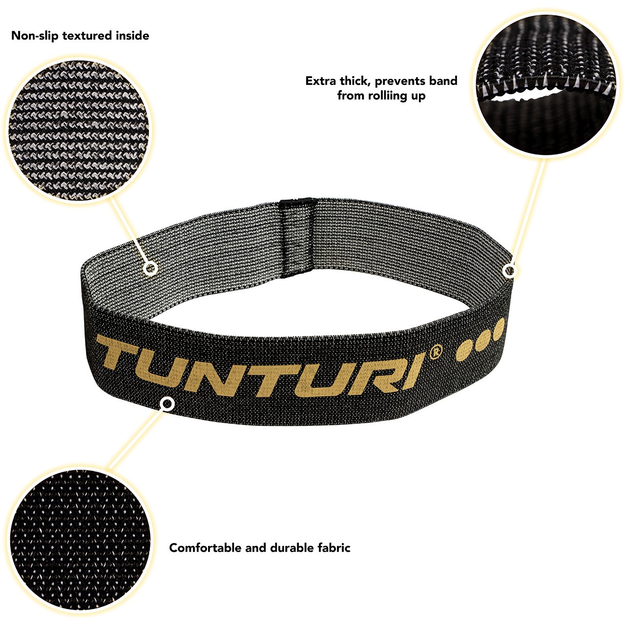 The exercise bands from Tunturi are made of high quality, robust and environmentally friendly material. The textile used is a mixed product made of cotton, polyester, elastic fabric and non-slip soft materials. The textile gymnastic bands therefore do not cut into the skin, do not slip or roll up when being used.