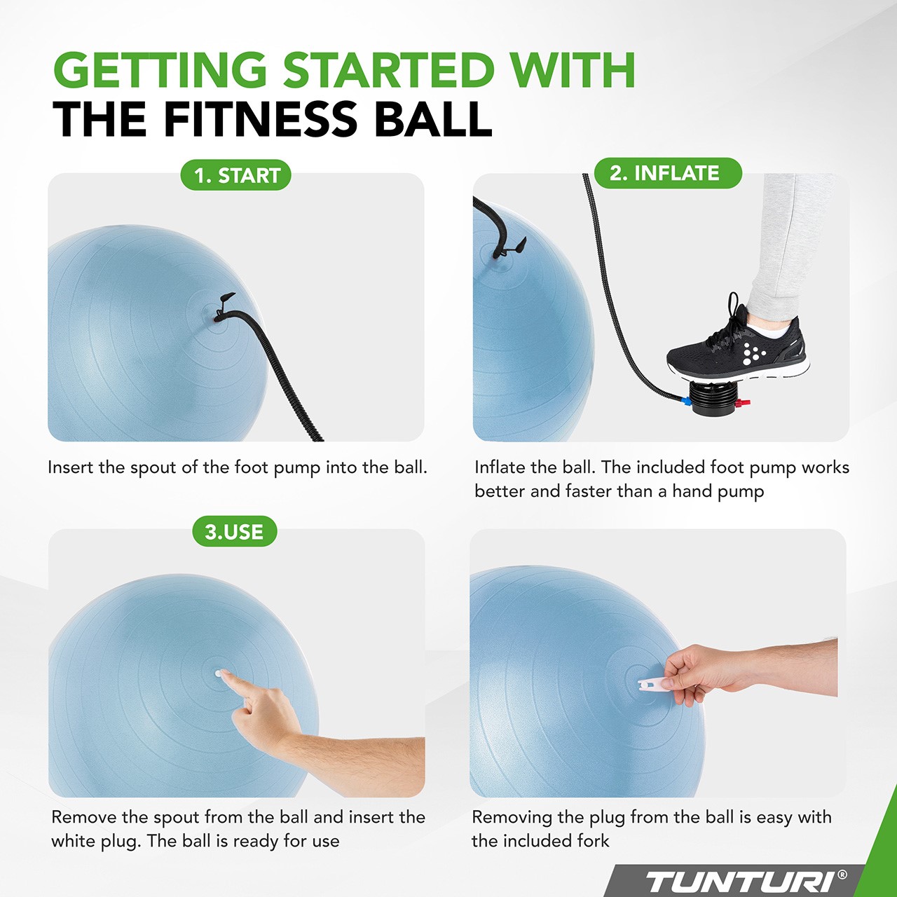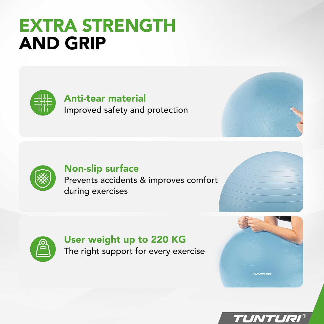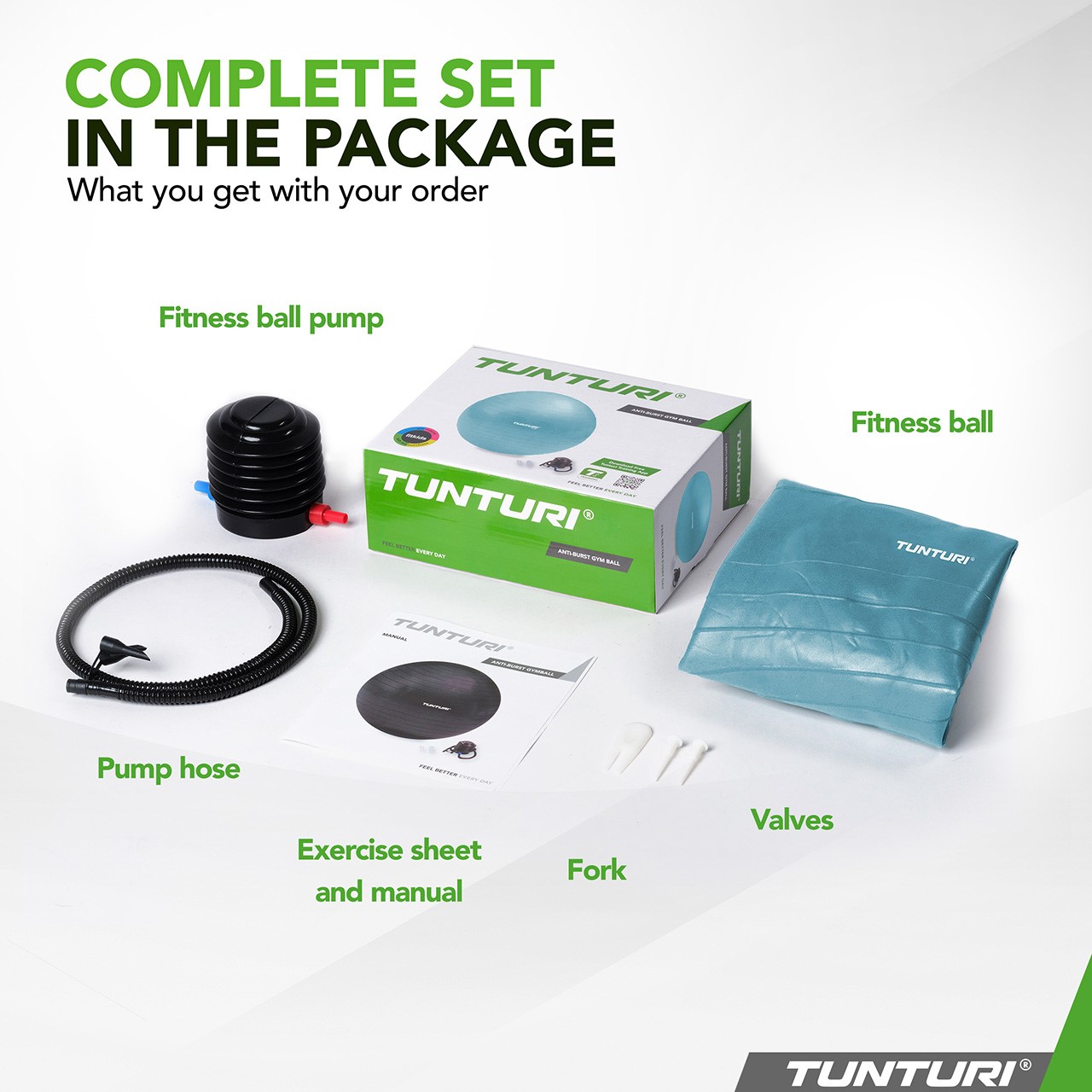 The Tunturi fitness ball is particularly practical to use. Thanks to the included ball pump, fork, and valves, it can be quickly inflated and easily deflated when needed. The high-quality anti-burst material is not only durable but also easy to clean and long-lasting.