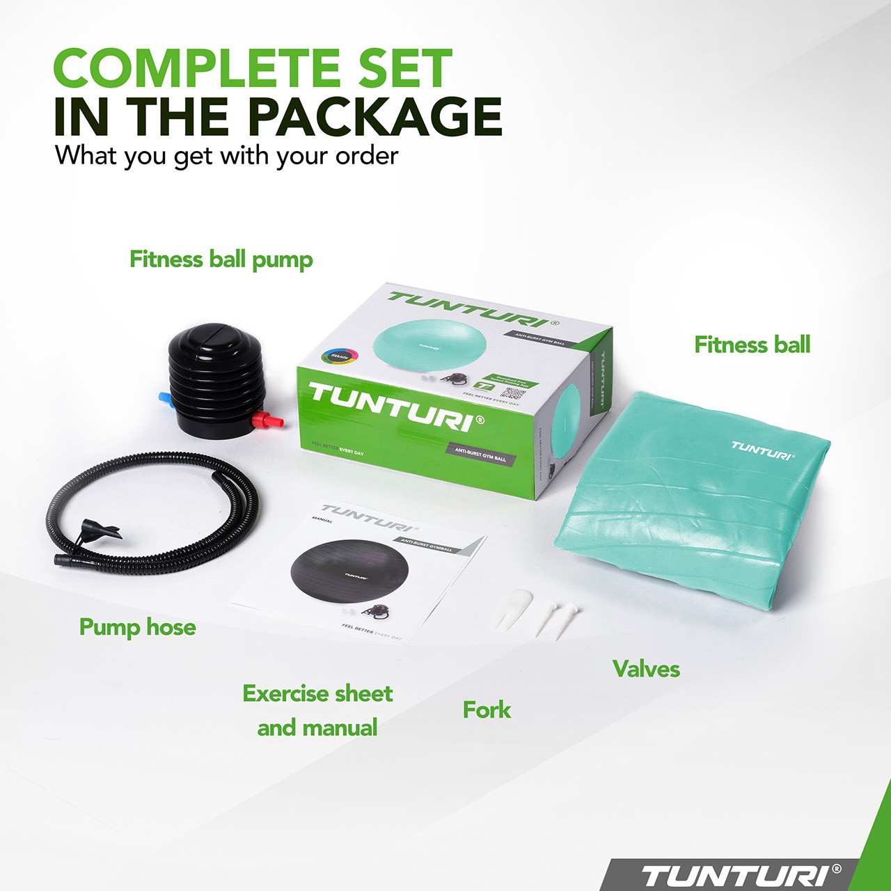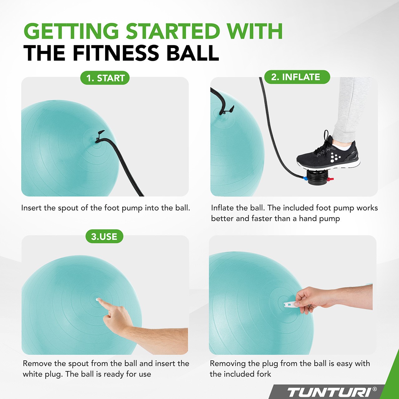 The Tunturi fitness ball is particularly practical to use. Thanks to the included ball pump, fork, and valves, it can be quickly inflated and easily deflated when needed. The high-quality anti-burst material is not only durable but also easy to clean and long-lasting.