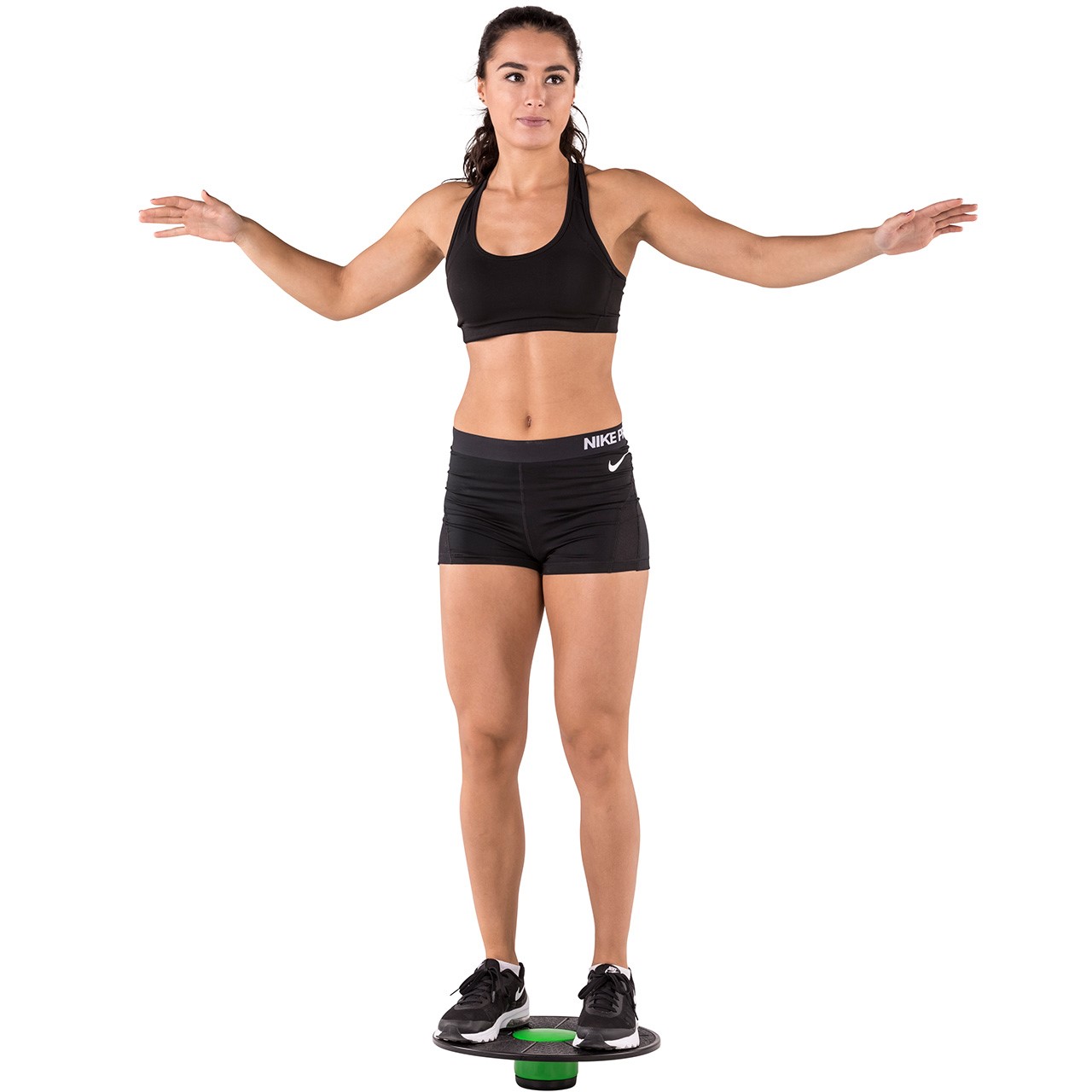 The Tunturi balance consists of a plate and a green foot on its bottom. In order to stand straight on this training board, your body has to seek balance continuously.