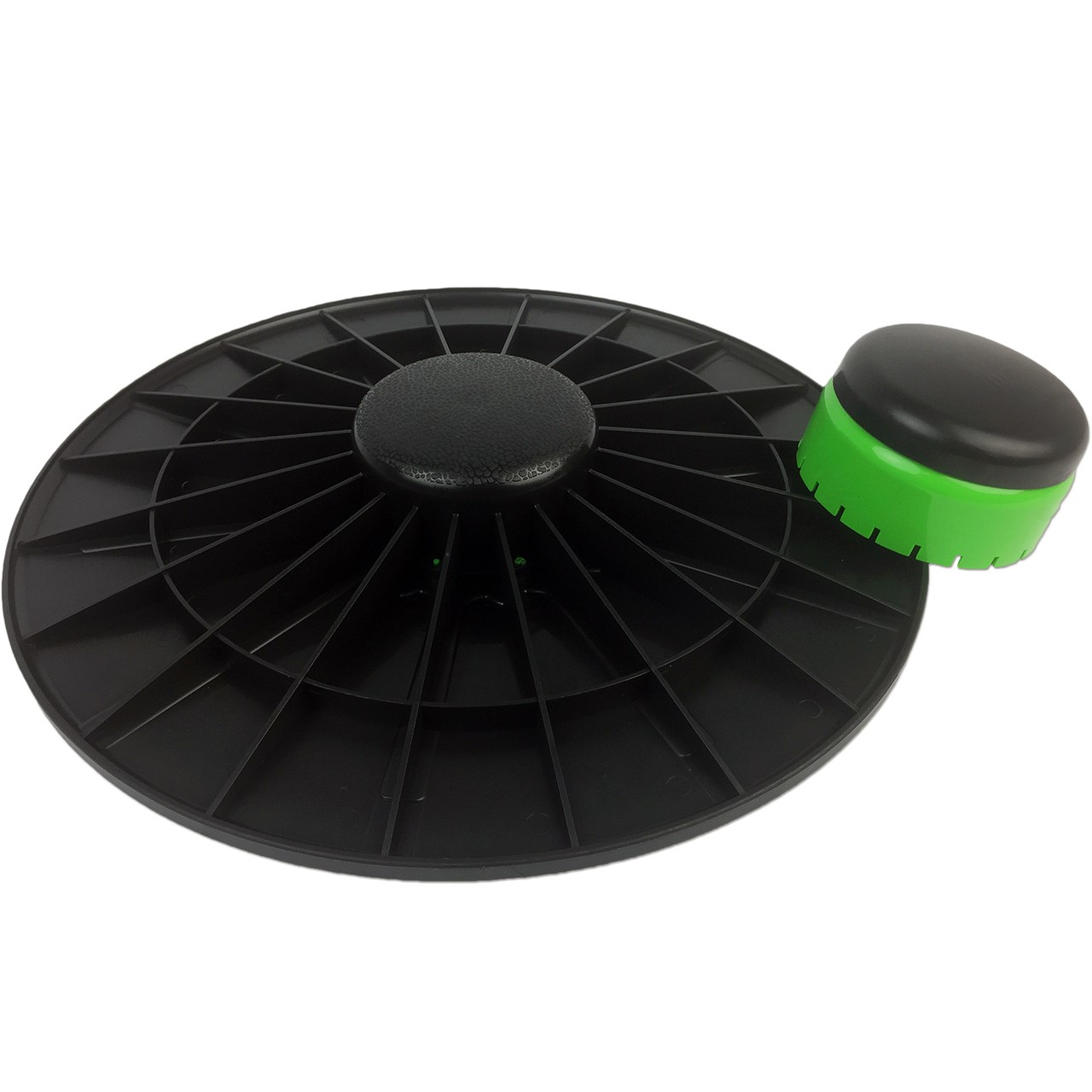Intensity of balance training can be changed by using the black cap, which is below the green foot. As soon as the cap is mounted, the training becomes more intense. If it is too heavy, the cap can be removed again to reduce the angle and lower the workout level. With cap the angle is at 20 degrees, without cap it is at 10 degrees. The larger the angle, the more the body has correct its position to stand upwards on the trainer.