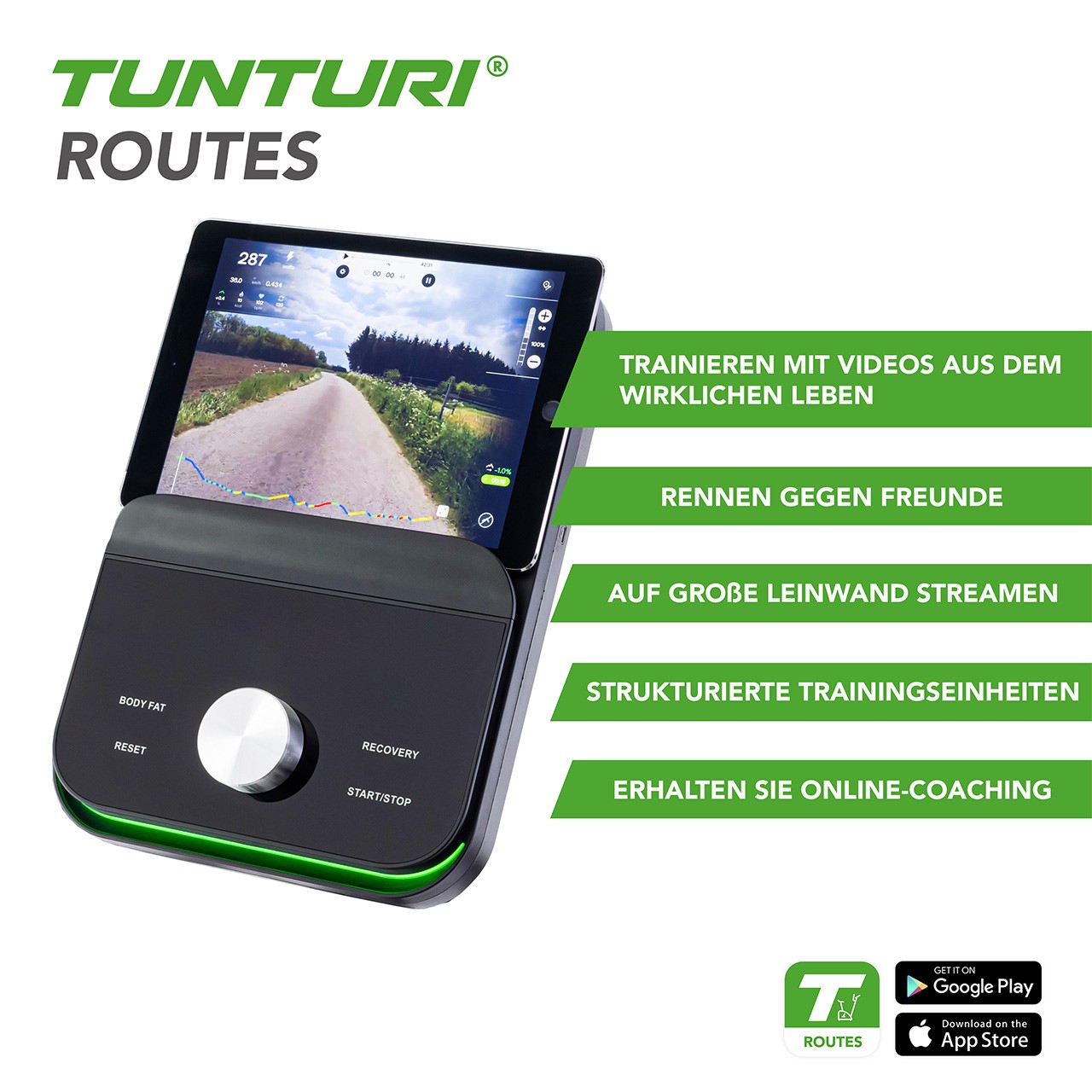 Apps for Tablets and Smart Phones: | Tunturi Routes, i-Console+, Kinomap & Zwift |