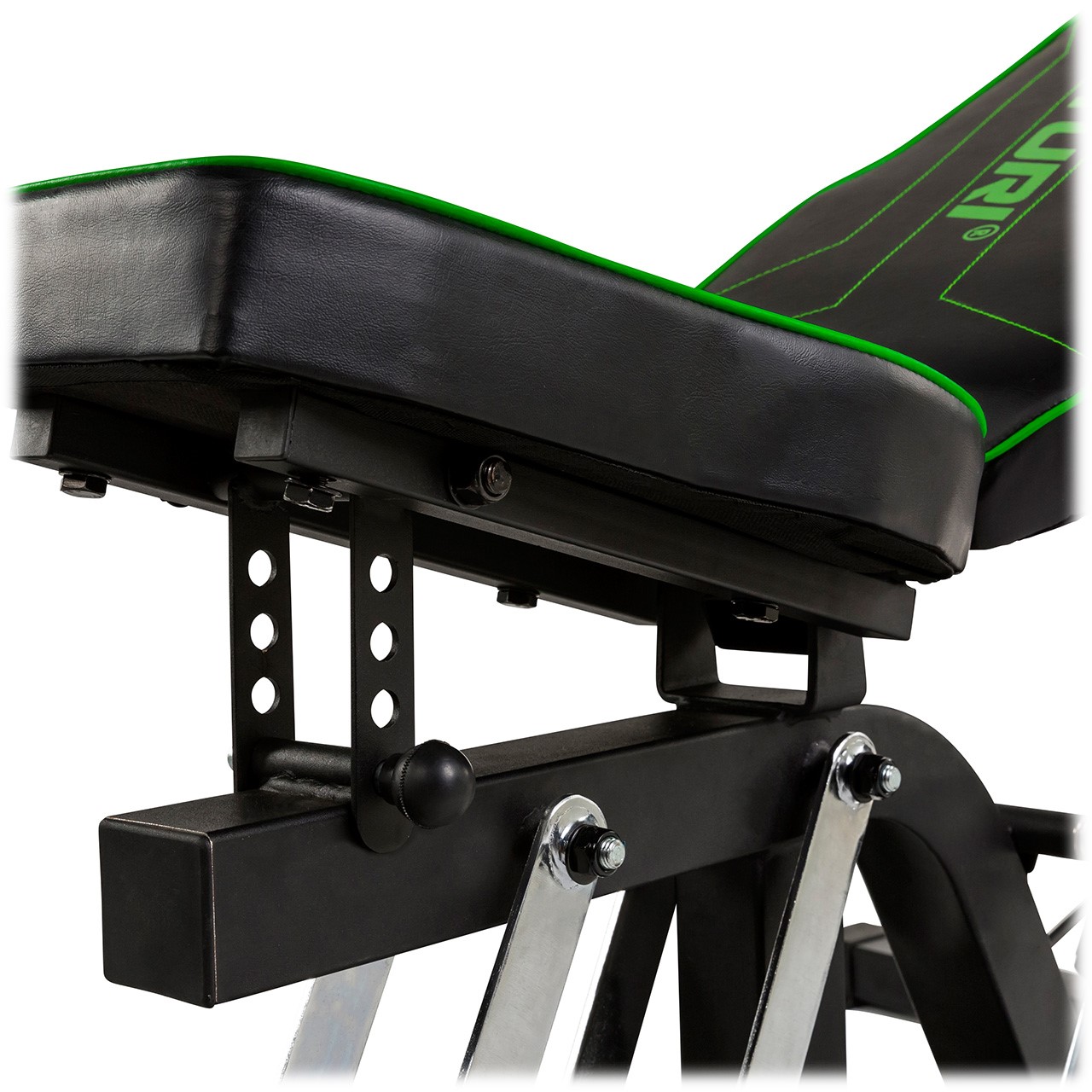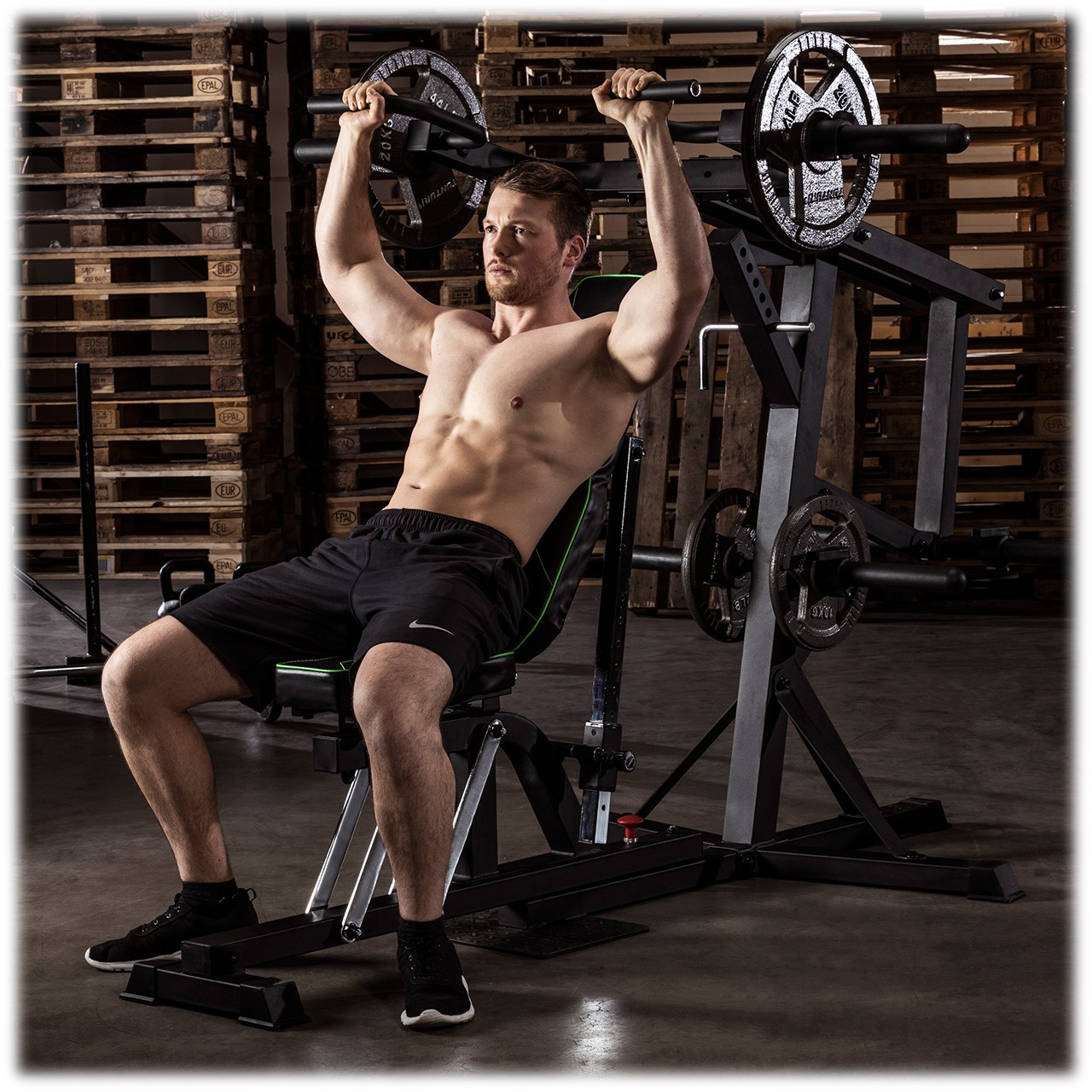 You can adjust the intensity of your workout by loading the desired number of weight plates onto the lever arm. The plastic clips ensure the weights remain securely in place. Please note that weight plates are sold separately and are not included. The seat and backrest are fully adjustable, allowing both flat and incline positions. Additionally, the bench can be moved forward and backward to provide optimal training positions for every exercise.