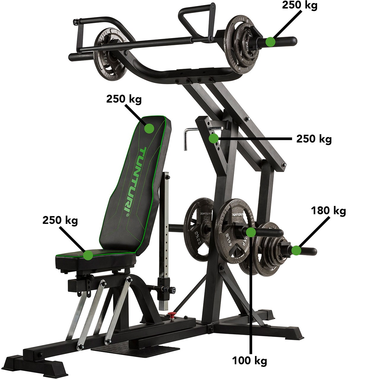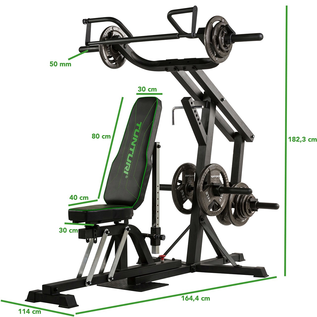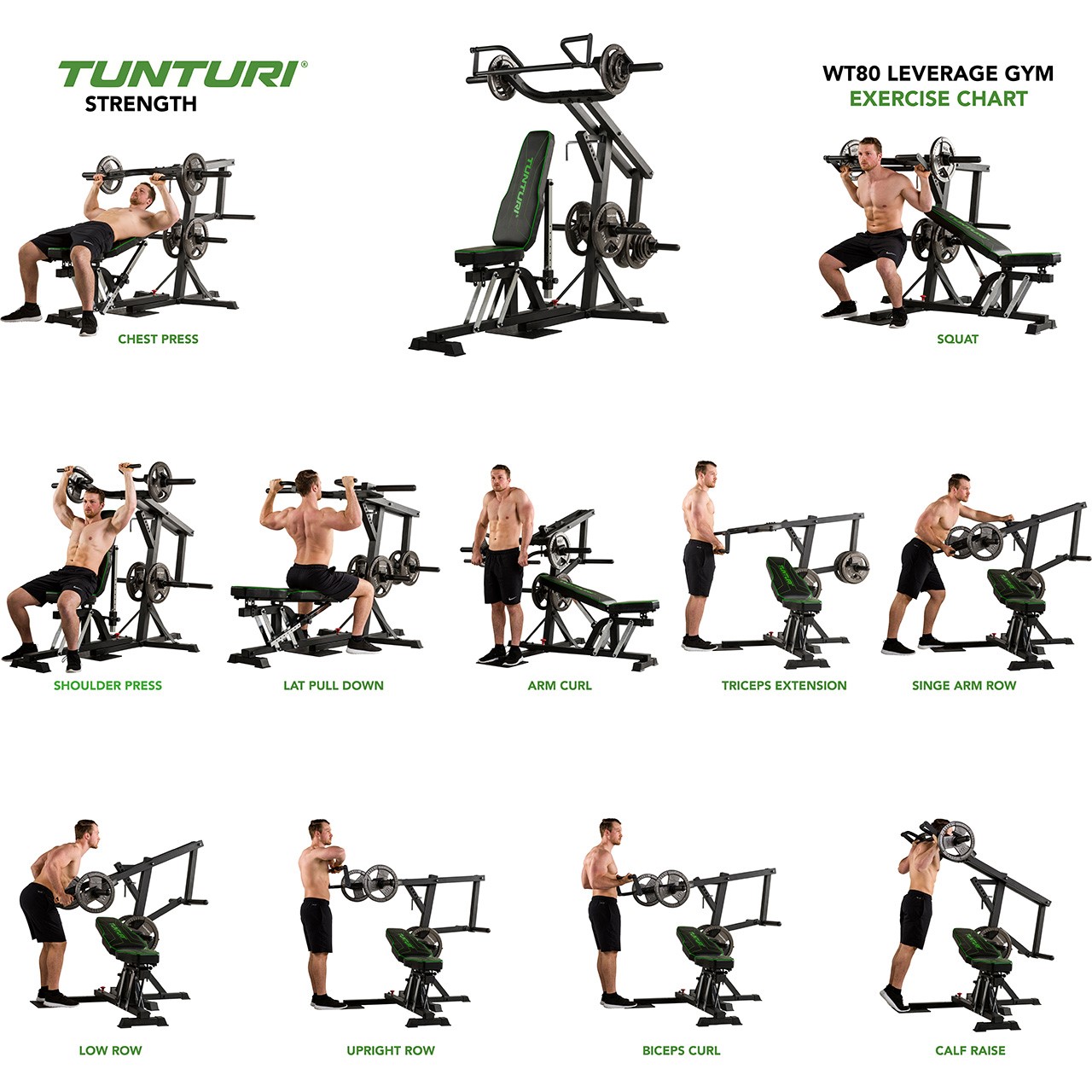The Tunturi WT80 Leverage Gym Power Station (17TSWT8000) is the compact premium version of a leverage gym, offering you a unique strength training experience. What sets this home gym apart is the use of leverage mechanisms instead of traditional dumbbells. The term "leverage" refers to the "lever effect," and this technology ensures safe and precise training that is specifically aimed at muscle building.