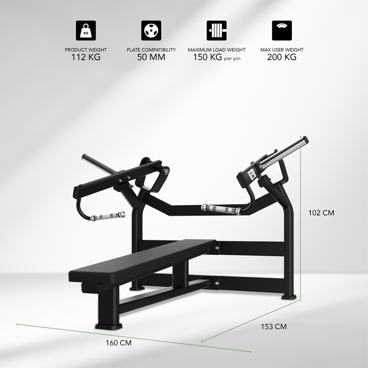 With the Tunturi Platinum Plate Loaded Horizontal Chest Press (25PVP18000), you experience a powerful and controlled horizontal press movement that ensures optimal activation of your chest muscles. This machine promotes balanced muscle growth, supports a natural range of motion, and allows for significant strength gains thanks to the plate-loaded resistance. Whether you are a beginner or an experienced strength athlete, this fitness machine is the perfect choice for effective chest training.