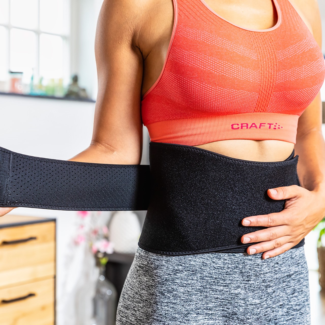 The Tunturi Pro Waist Band (14TUSCL398) is designed to support the core of the body during workouts and stretching.