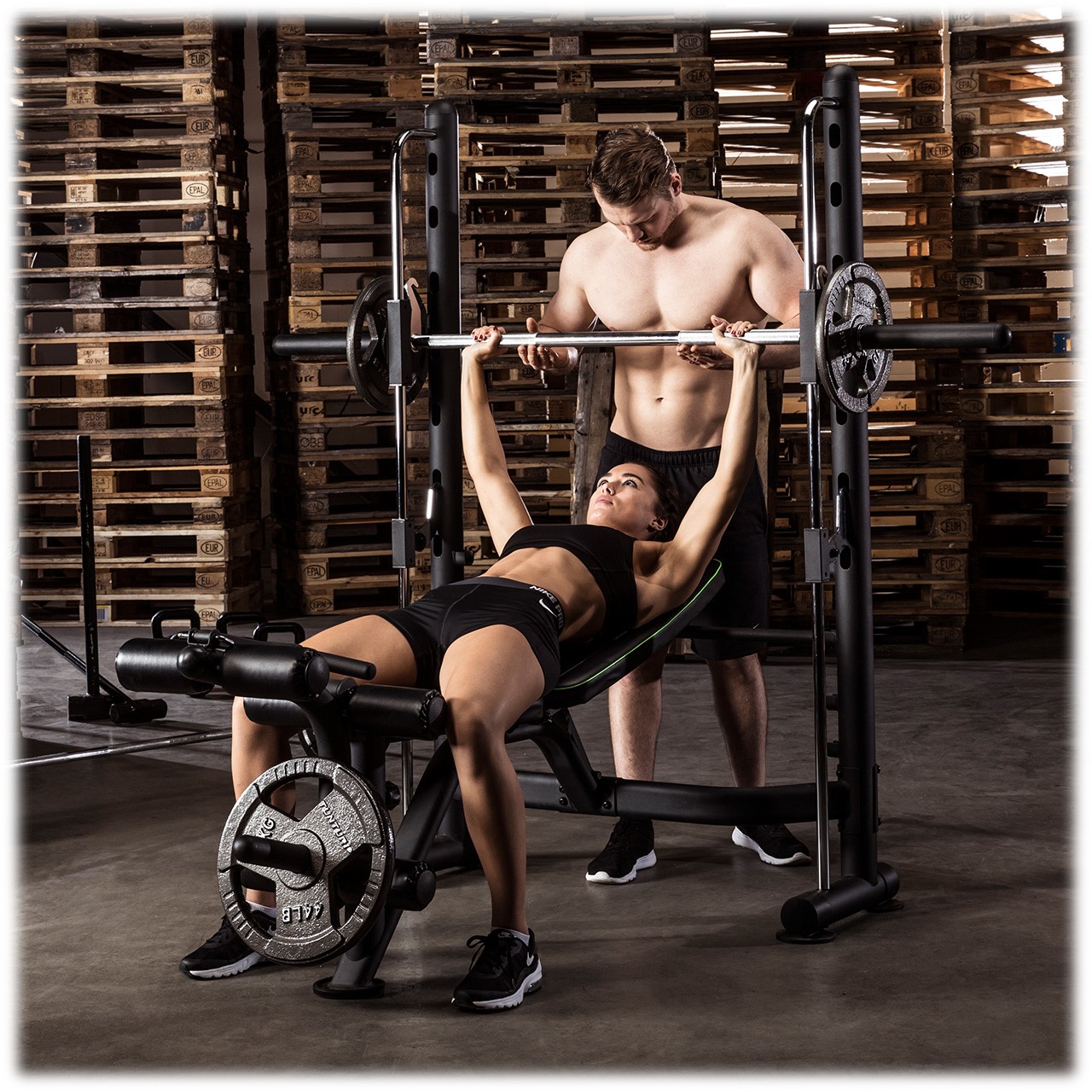 The SM60 ensures maximum safety during workouts with its robust barbell guide on a chrome bar with ultra-glide bushings and an adjustable safety catch. The multi-adjustable backrest allows for both incline and flat bench positions, while the adjustable Preacher Curl pad adds extra flexibility. The curl bar is included, and the integrated leg developer with extra-large foam padding guarantees maximum comfort during every workout.