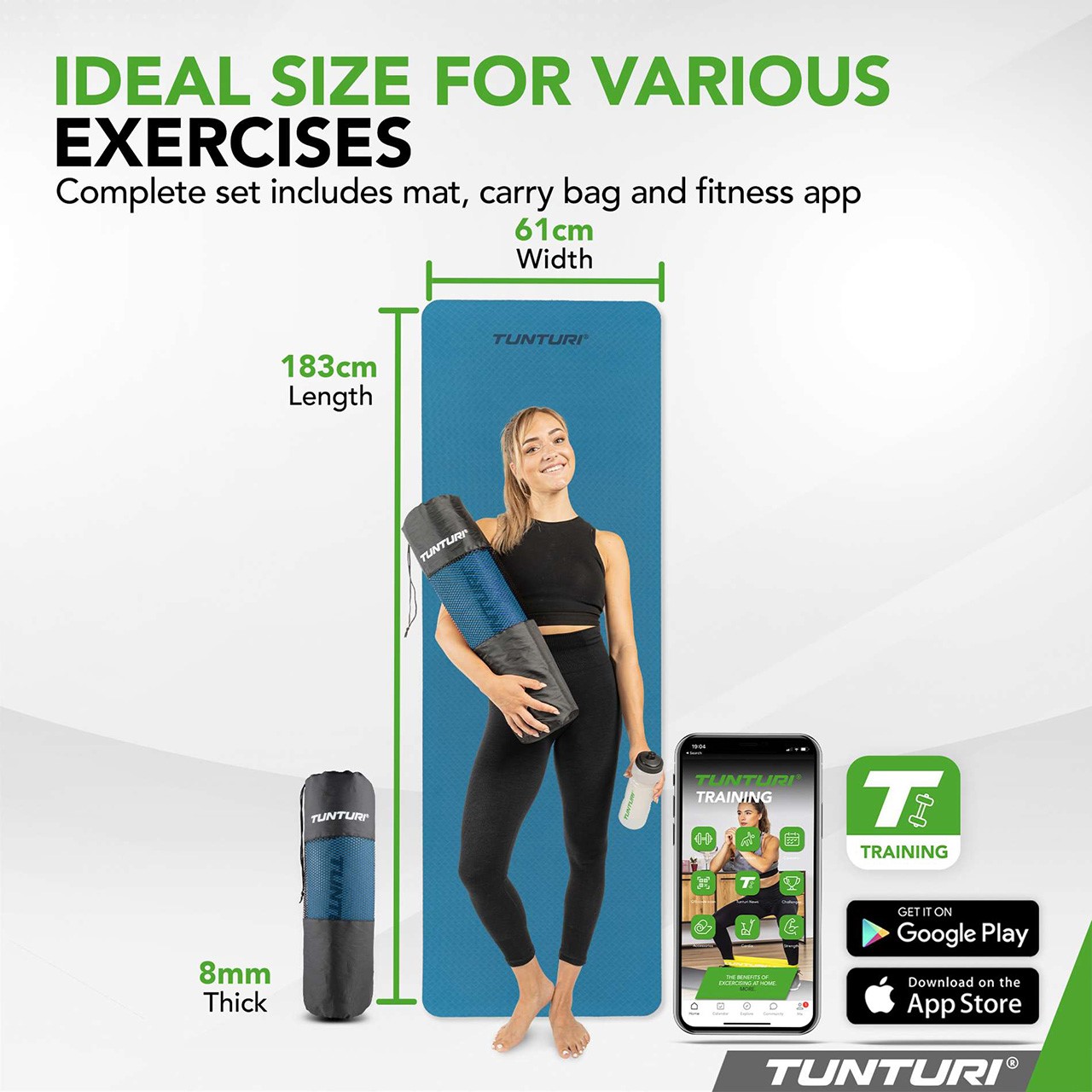 Whether for ab workouts or yoga – a mat ensures comfort and stability. The Tunturi Yoga Mat delivers optimal support and stability with its extra-thick 8 mm cushioning. Combining the functions of a yoga mat, fitness mat, and exercise mat, it is crafted from eco-friendly material that protects your muscles and joints while being kind to the environment.