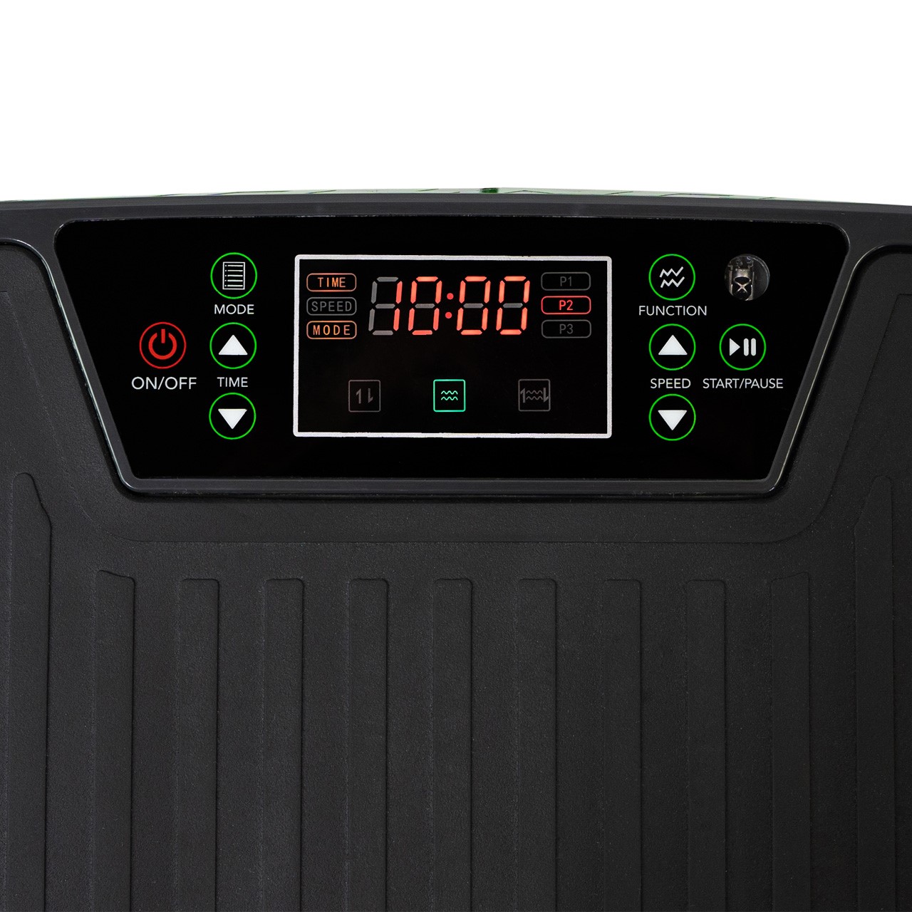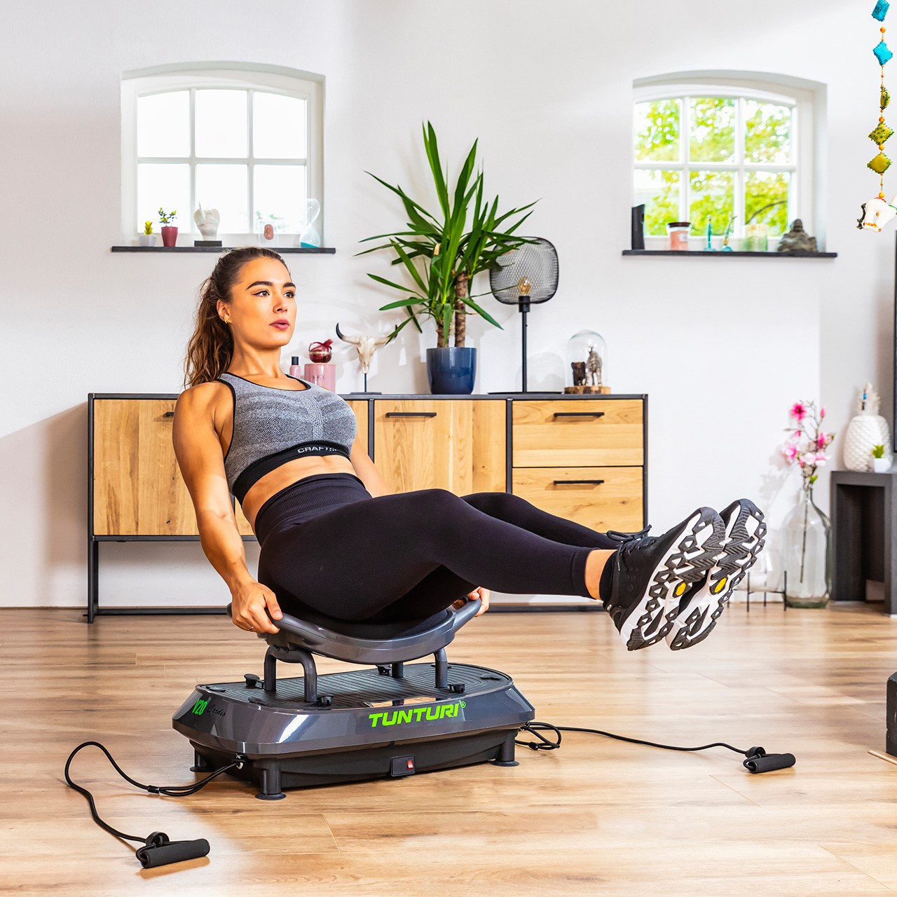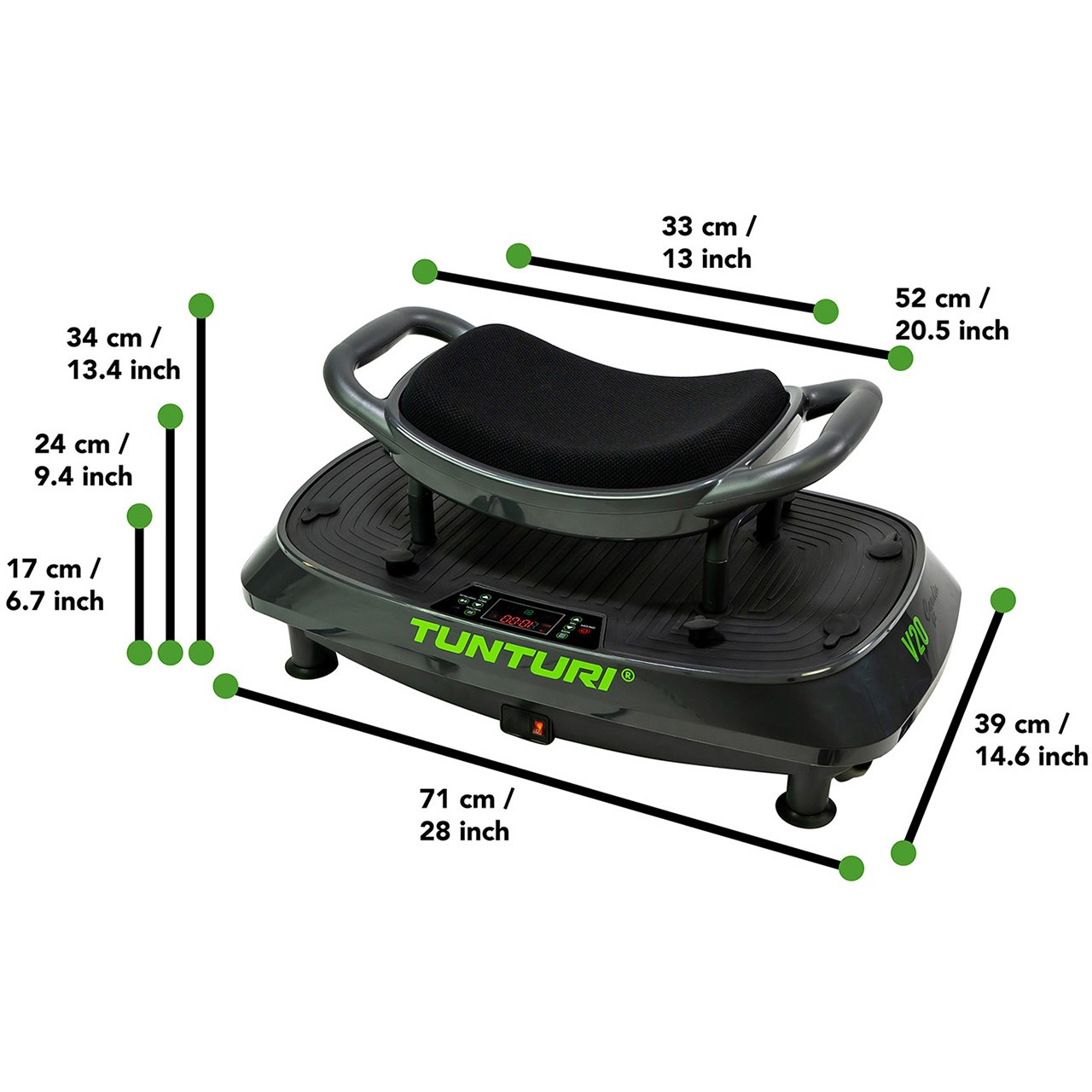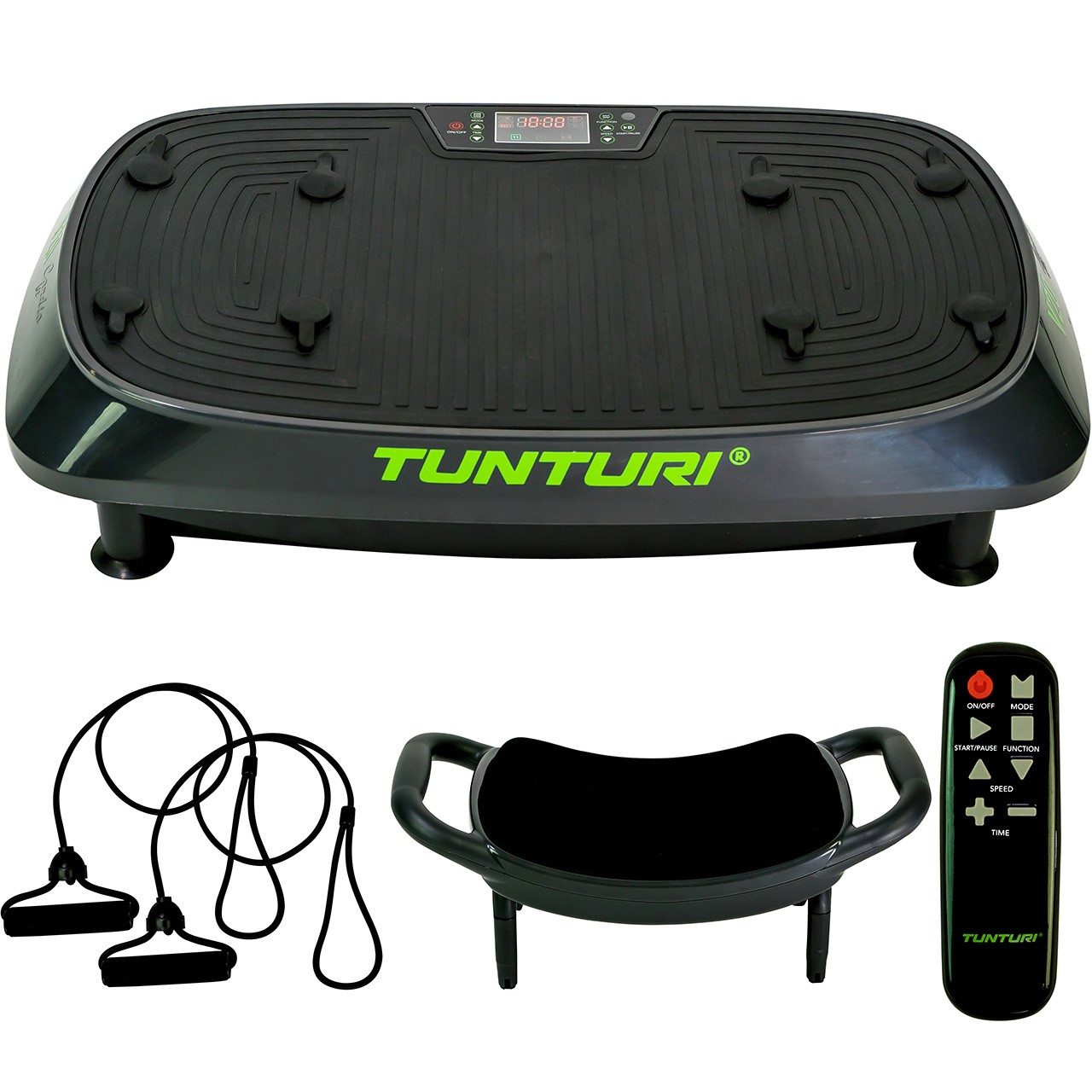 The Tunturi V10 Plate provides 30 different speed levels and contains 3 fixed and 1 manual mode. The included and removable chair is a support for shoulder, neck, thigh and back work outs. Also included in the box is the remote control.