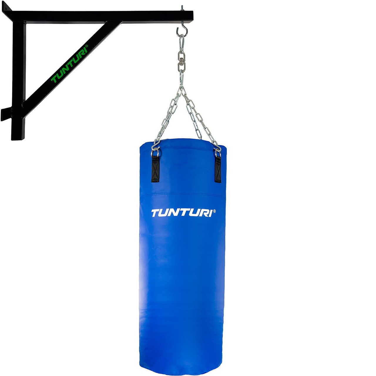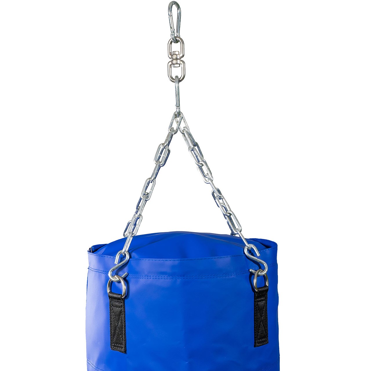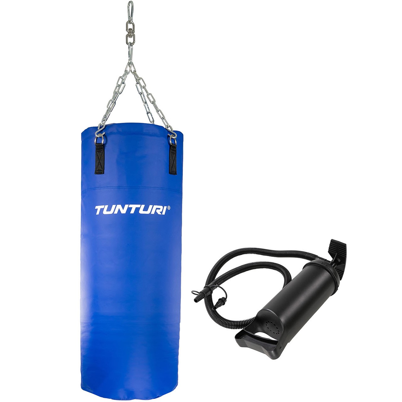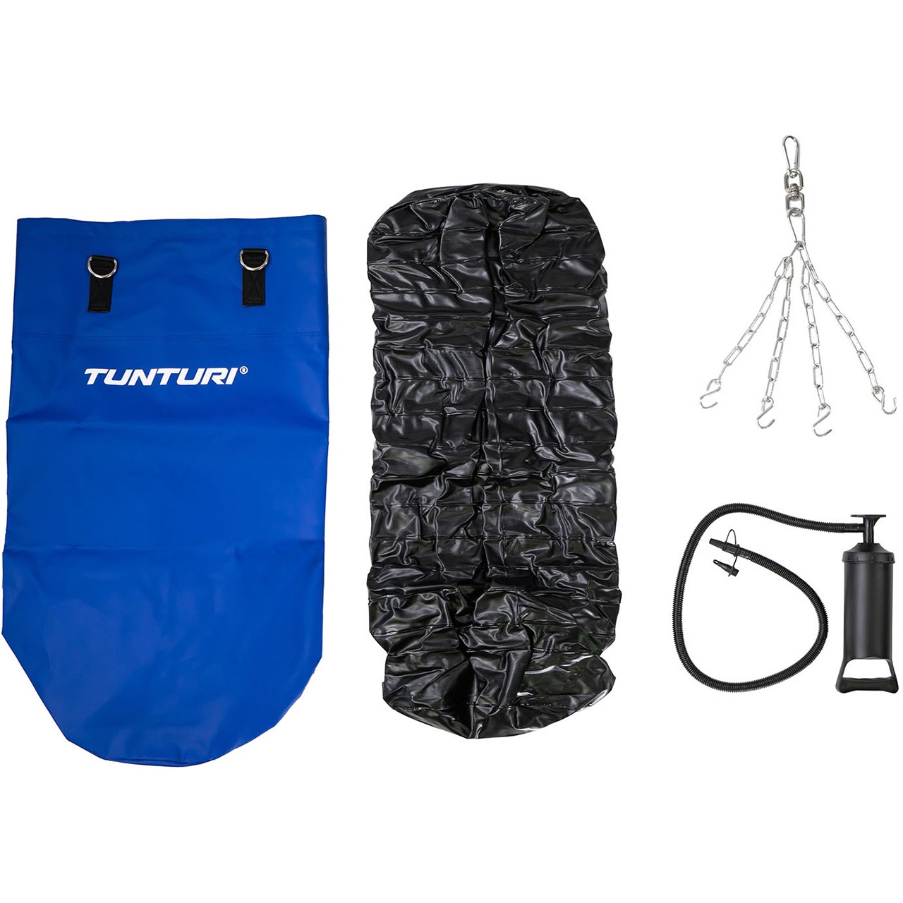 The Tunturi Aqua boxing bag consists of 2 bags: The inner bag (black), which is filled with water and the outer bag (blue), which has the chain connectors attached. In this set included are also an air pump, a chain set, a swivel, two snap hooks and a manual.