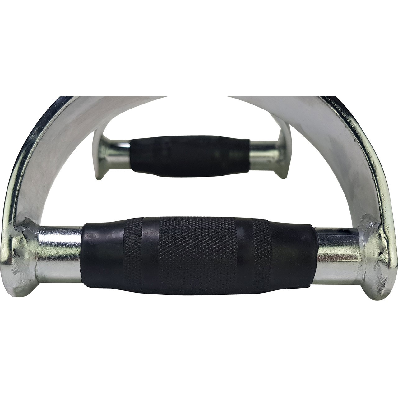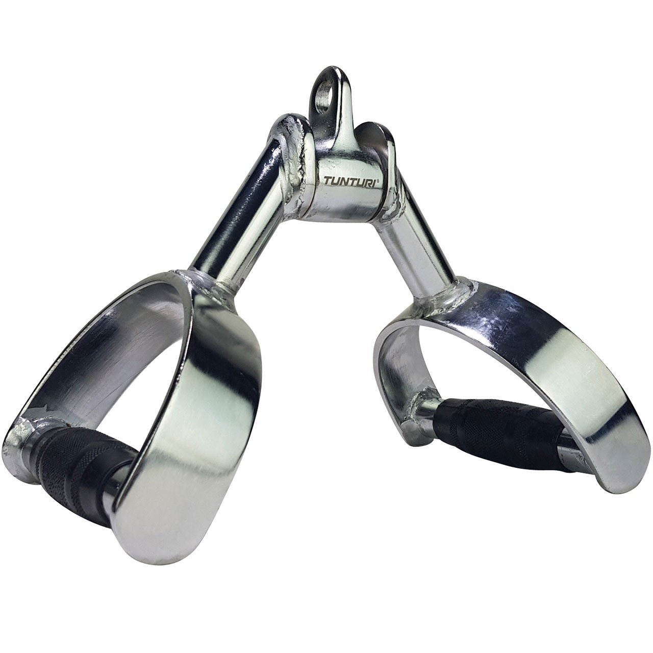 This chrome parallel grip from Tunturi (14TUSCL230) can be used for many different exercises at cable pulley stations, such as rowing for example. The handgrips are rotating and the hook connection will be connected to any cable pulley by a snap hook. This parallel grip is extremely stable and long-lasting.