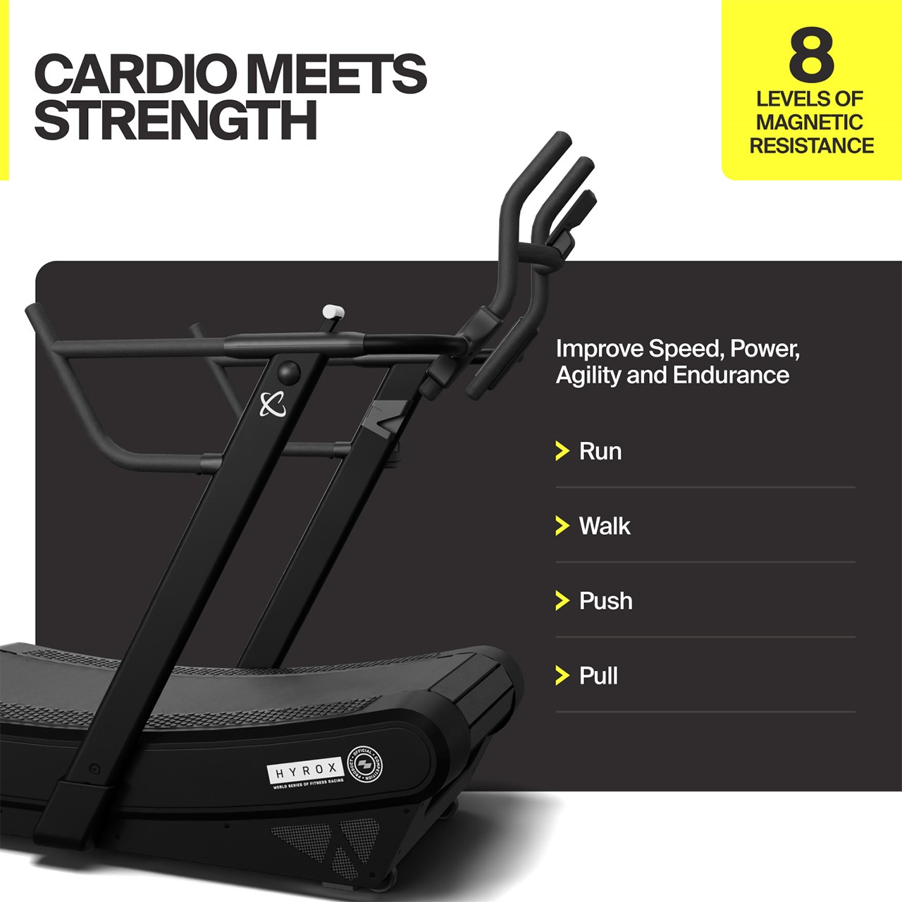 Le Hyrox Perform Tread (NMT-1) est un appareil de cardio sans moteur, auto-alimenté, conçu pour répondre aux exigences les plus élevées. Développé pour les athlètes ambitieux souhaitant améliorer leurs performances de manière ciblée, ce tapis de course incurvé optimisé offre 8 niveaux de résistance magnétique, un design innovant et une intensité d’entraînement maximale – sans aucun branchement électrique.