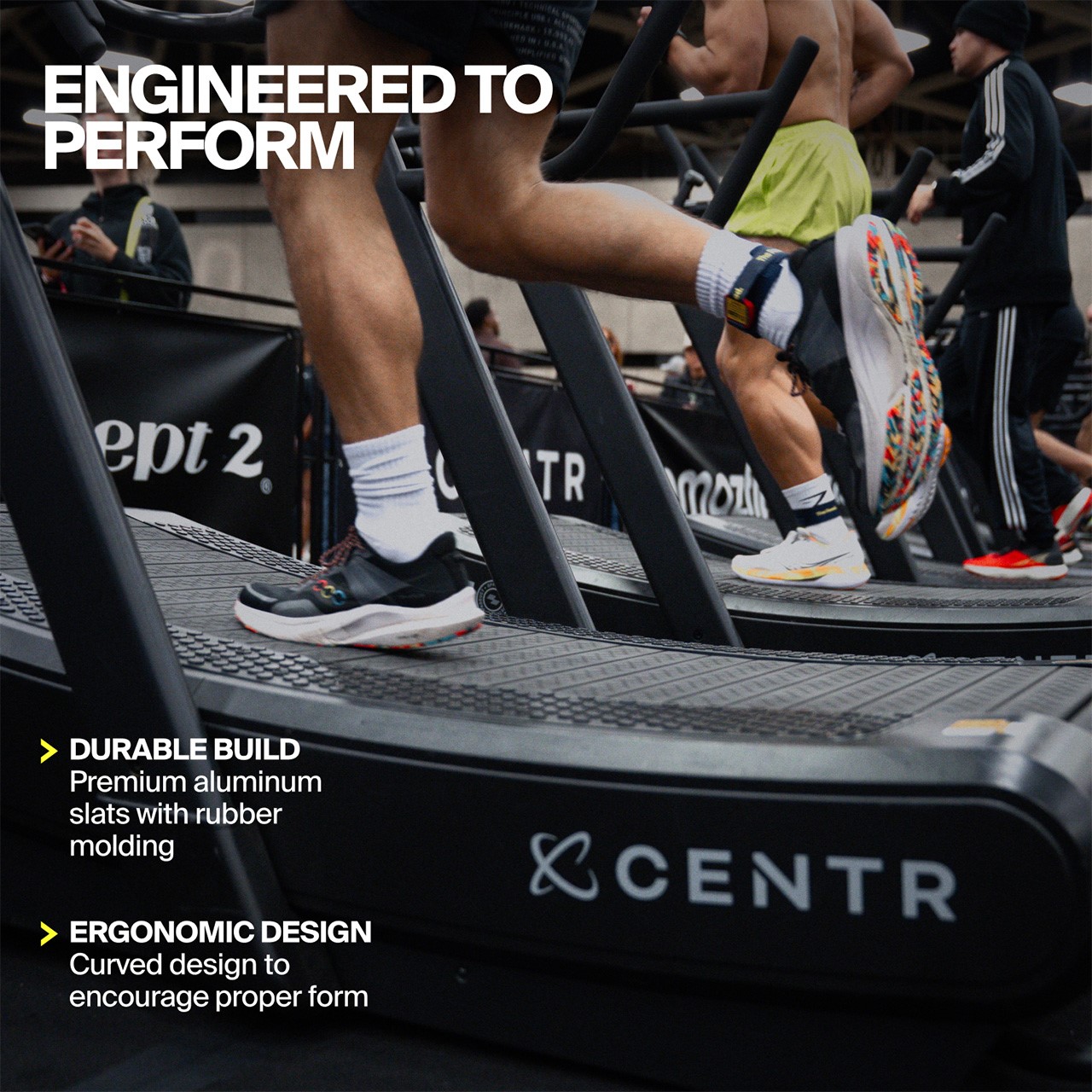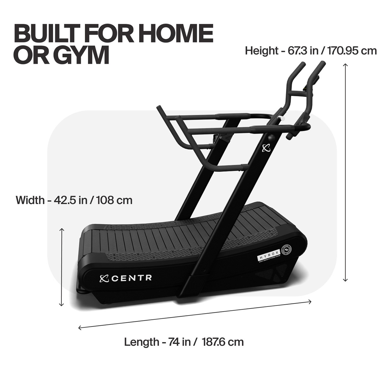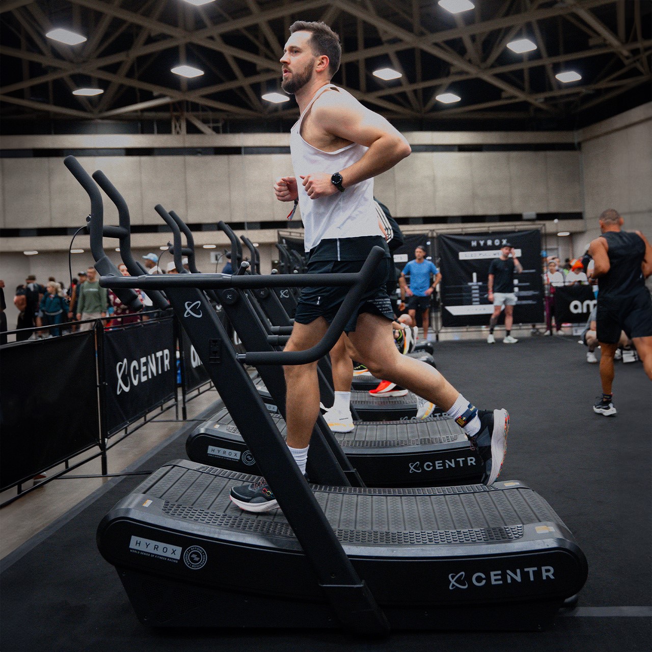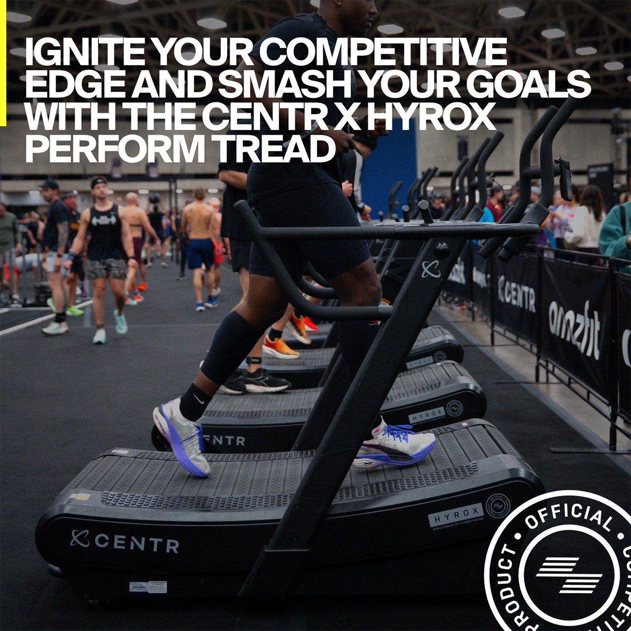 En tant que partenaire officiel d’équipement Hyrox, Centr a développé un tapis de course spécialement adapté aux exigences des compétitions HYROX.