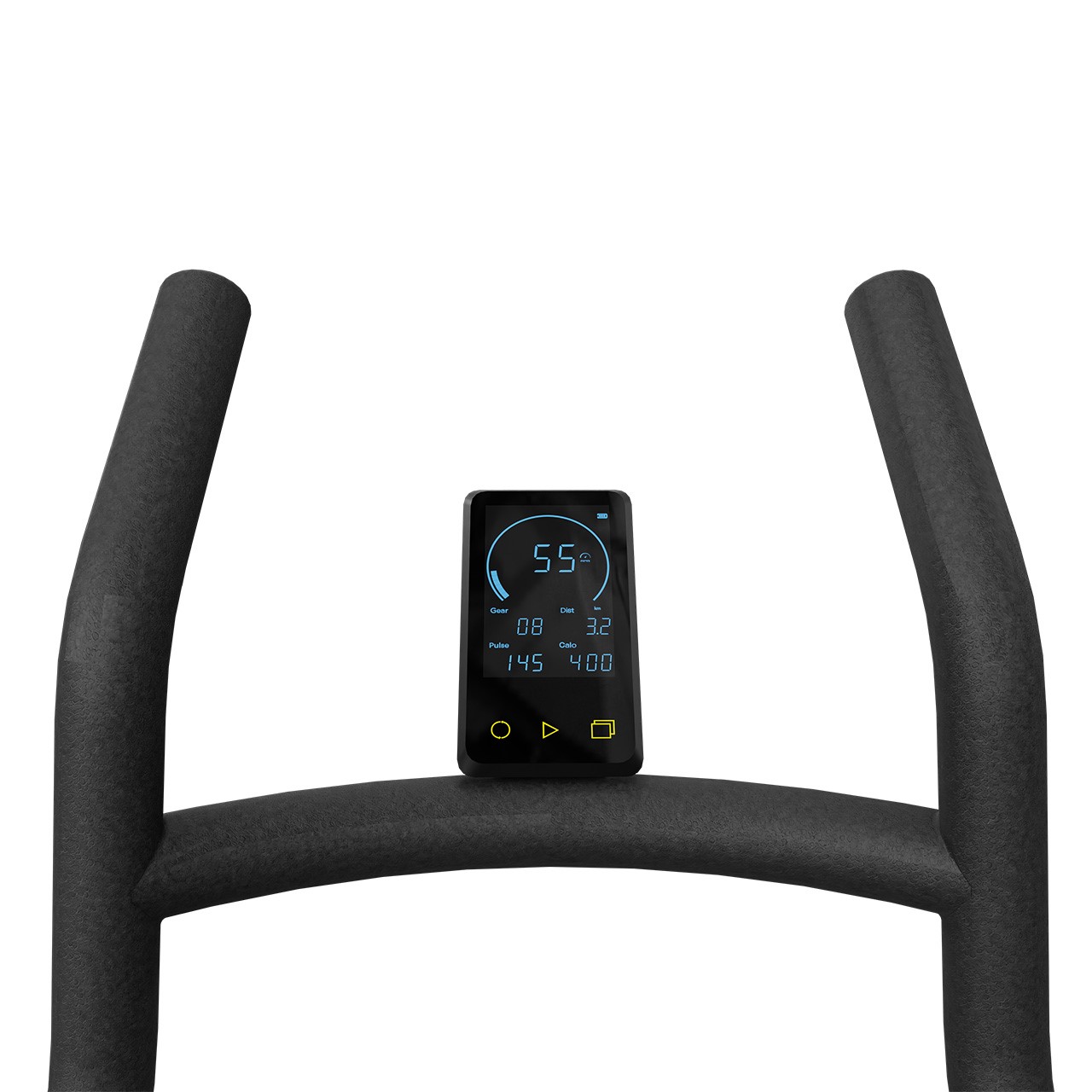 L’écran LED rétroéclairé de 4,8 pouces affiche toutes les données essentielles en un coup d’œil : Vitesse, Résistance, Distance, Temps, Puissance en watts, Fréquence cardiaque, Calories brûlées