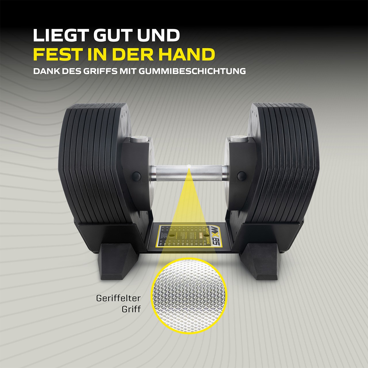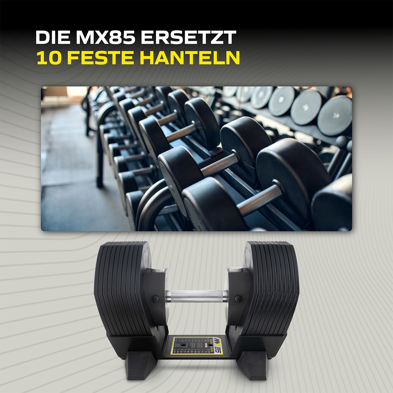 Une paire d'haltères MX55 remplace un ensemble complet de 10 paires d'haltères, tout en n'occupant qu'un dixième de l'espace. Cela en fait la solution idéale pour votre salle de sport à domicile. Que vous planifiiez un entraînement de force, de musculation ou une séance intensive, les haltères MX55 vous offrent la sécurité, la précision et le confort dont vous avez besoin.
