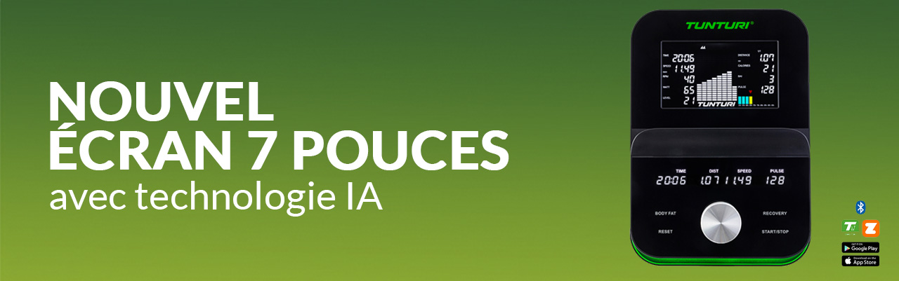 Le nouvel écran 7 pouces affiche toutes les données de façon claire, tandis que des applications comme Tunturi Routes, iConsole+ et Zwift apportent une motivation supplémentaire.