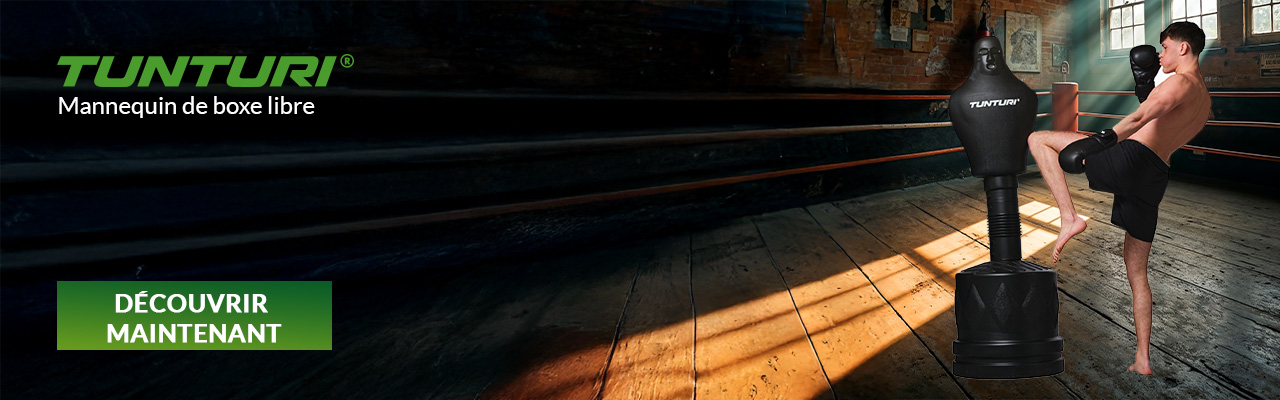 Vous souhaitez cibler votre travail technique, améliorer vos réflexes et ajouter du fun à vos séances ? Un mannequin de boxe sur pied Tunturi est le partenaire idéal. Comme un sac sur pied, il ne nécessite aucun montage au plafond – il est prêt à l’emploi et peu encombrant.